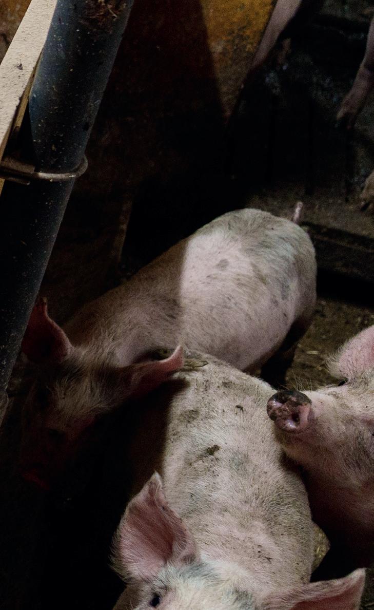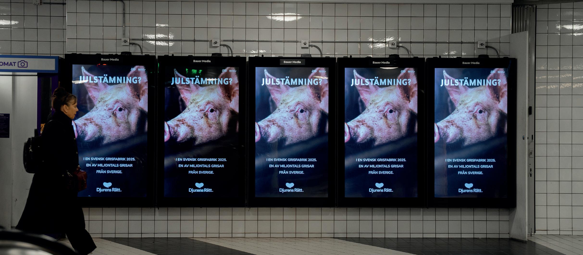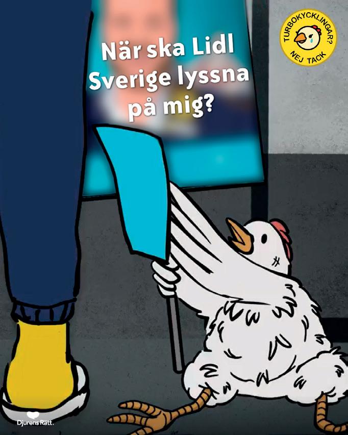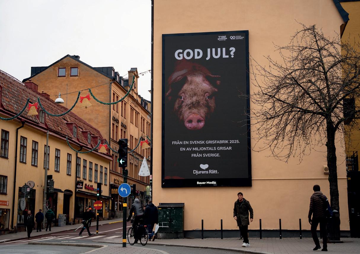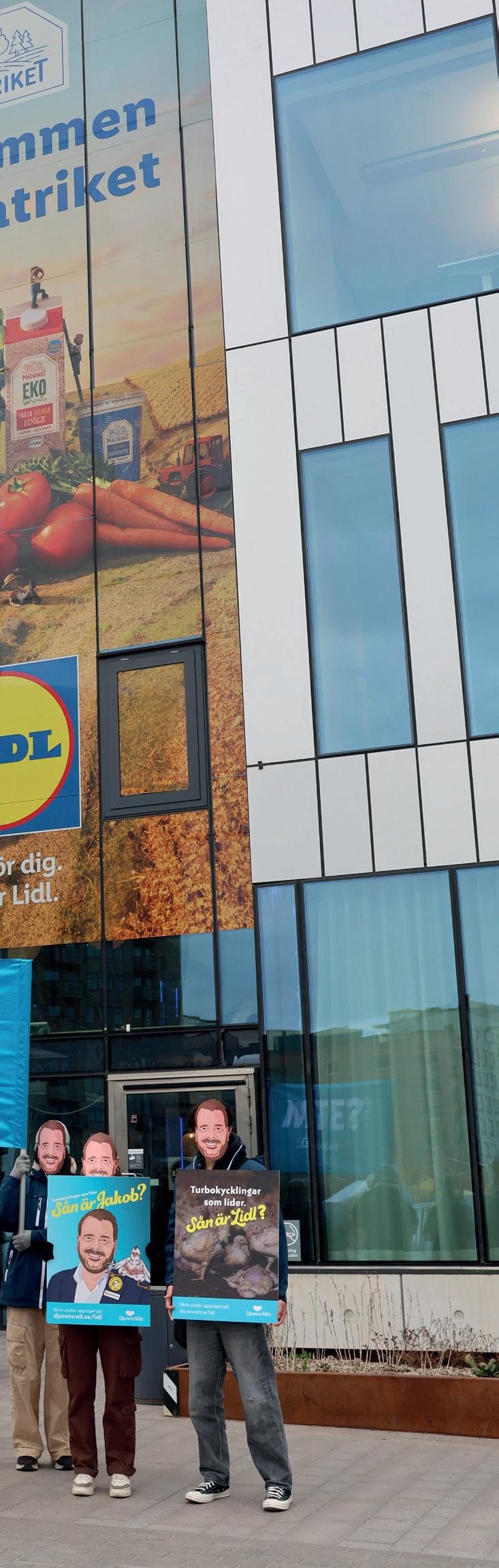 miljoner kycklingar i Sverige. Under årets sista månader visade vi också upp insidan av svenska grisfabriker. Fem olika anläggningar dokumenterades och polisanmäldes. Genom en stor annonskampanj nådde vi miljoner svenskar med bilder som visar grisarnas verklighet. Vi hymlar inte med vårt slutmål: en värld där djur respekteras som kännande individer med rätt till sina egna liv – en värld där kycklingar och andra djur inte har en plats på våra tallrikar.