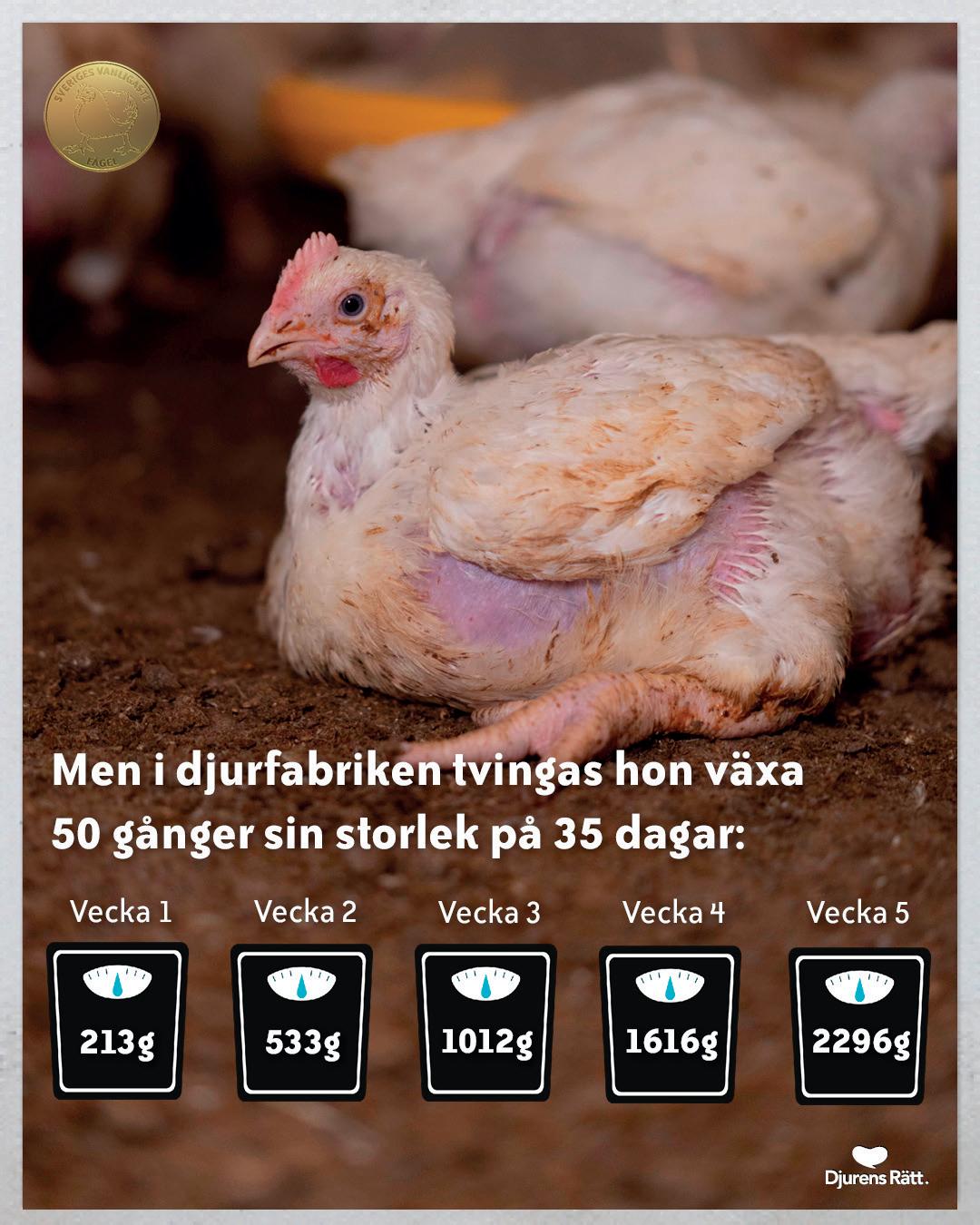 Även på hemmaplan har vi behövt synliggöra behovet av en seriös röst för djuren hos våra makthavare. När politiska utspel förminskar djurens lidande har Djurens Rätt stått stadigt på djurens sida och fortsatt tala klarspråk. Våra granskningar visar hur turbokycklingar fortfarande föds upp under extremt dåliga förhållanden, i kroppar de knappt orkar bära upp. Deras situation borde vara vår tids största djurpolitiska fråga, men är idag som ett laglöst land. Det här är ovärdigt en nation som påstår sig vara världsbäst på djurskydd.