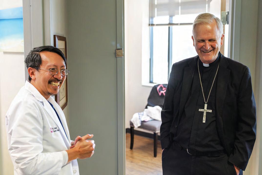 DR. THAI NGUYEN was not only born and raised in the Catholic Church — he even lived on Catholic Church property until he moved away to college. His parents immigrated to the United States from Vietnam in 1975 after the war and were sponsored by the Diocese of Lafayette in Louisiana. The diocese relocated his parents, along with a few other families, to St. Helena Parish, where they were able to live and settle on the open land that the church had available. After his 30-minute school bus ride home, he had just enough time to drop off his backpack and sprint to attend daily Mass at 4 p.m. He became an altar server in second grade, which rooted his Faith. In 2009, he made the pilgrimage to the Holy Land with three priests and 40 other pilgrims. It was in the Holy Land where he met his wife, Ruth Ann. Dr. Nguyen was trained at Our Lady of the Angels, a Catholic hospital associated with Louisiana State University. He has been involved with different Catholic medical organizations on the national and local levels to promote the principles of the Catholic faith in the practice of medicine.