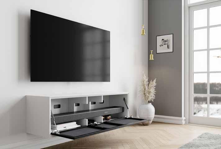 Le meuble lisse, robuste et solide SynoStone, dans les couleurs exclusives graphite grey et pure white, est parfait pour supporter sans effort le téléviseur et la barre de son.