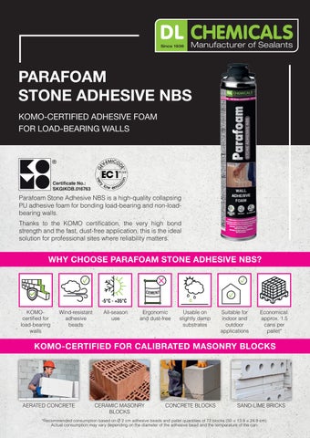 Parafoam Stone Adhesive NBS replaces traditional mortar and mechanical fixings and enables faster, cleaner and more ergonomic working. The collapsing adhesive foam ensures precise positioning and a reliable end result, even in windy or other challenging site conditions.