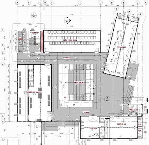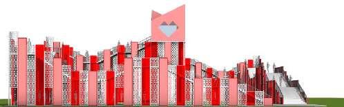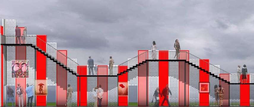 the shopping mall terraces become stadium stands when the brise soleil [stadium seating) is projected forward to fully form the seats for the spectators