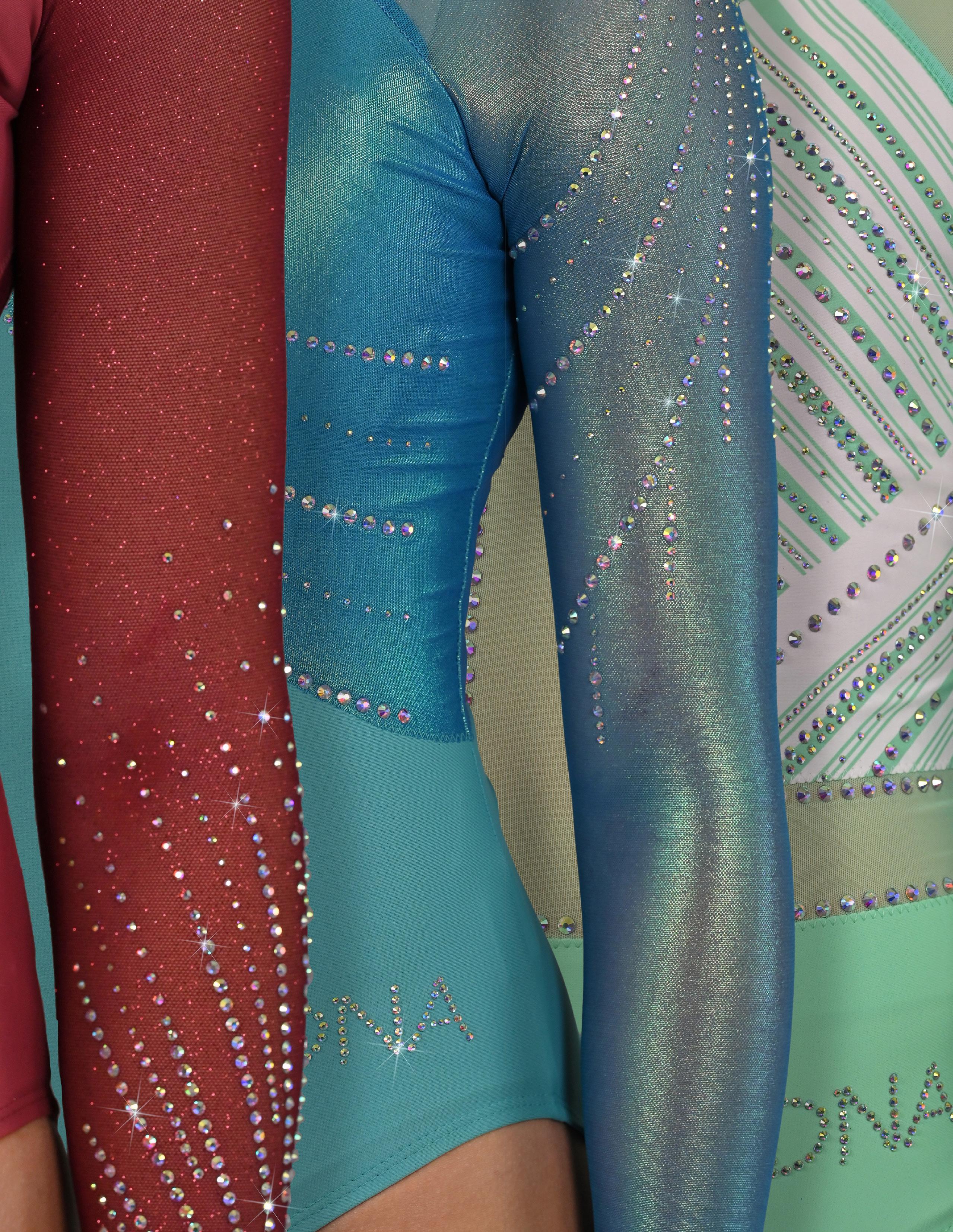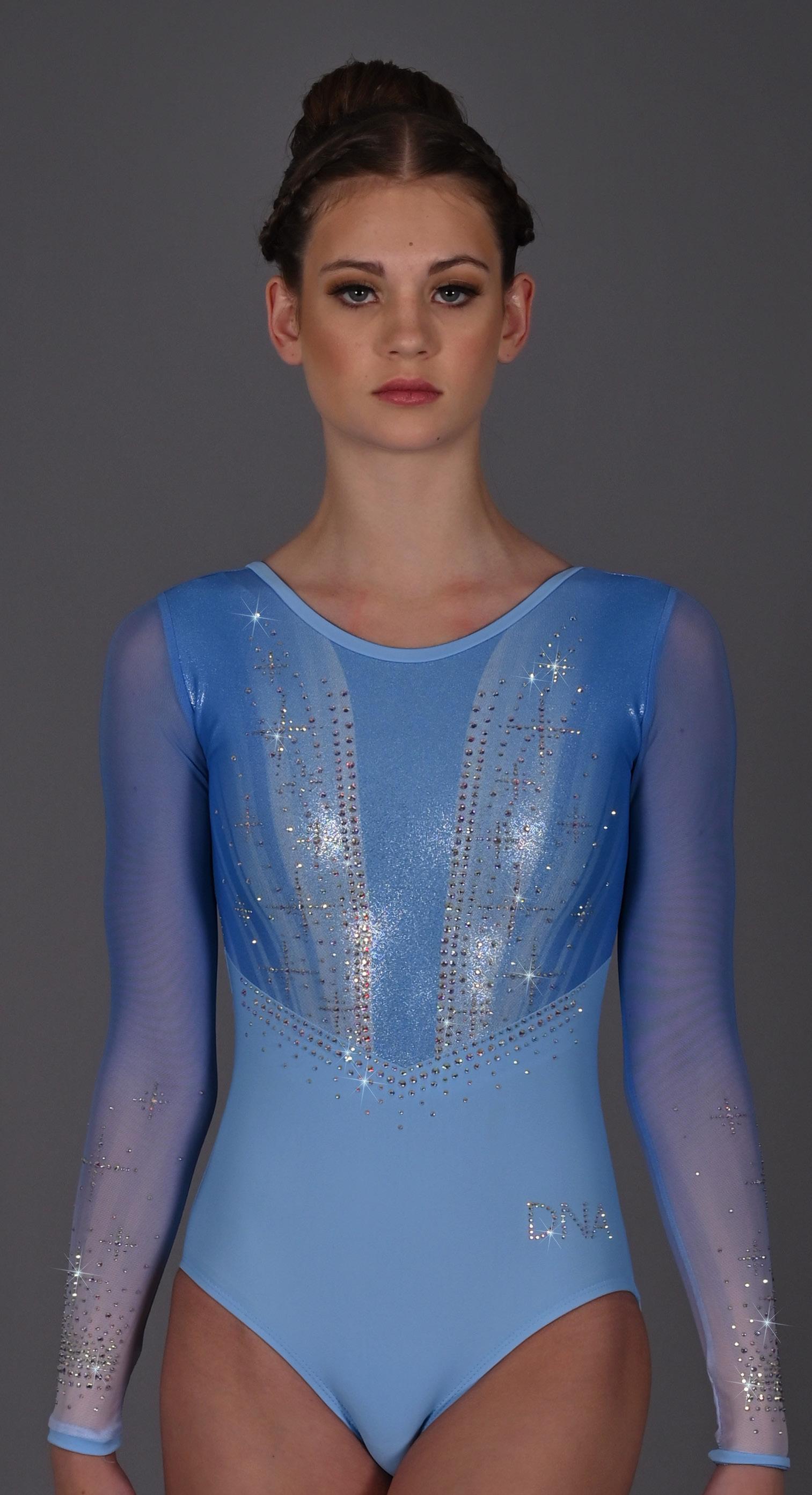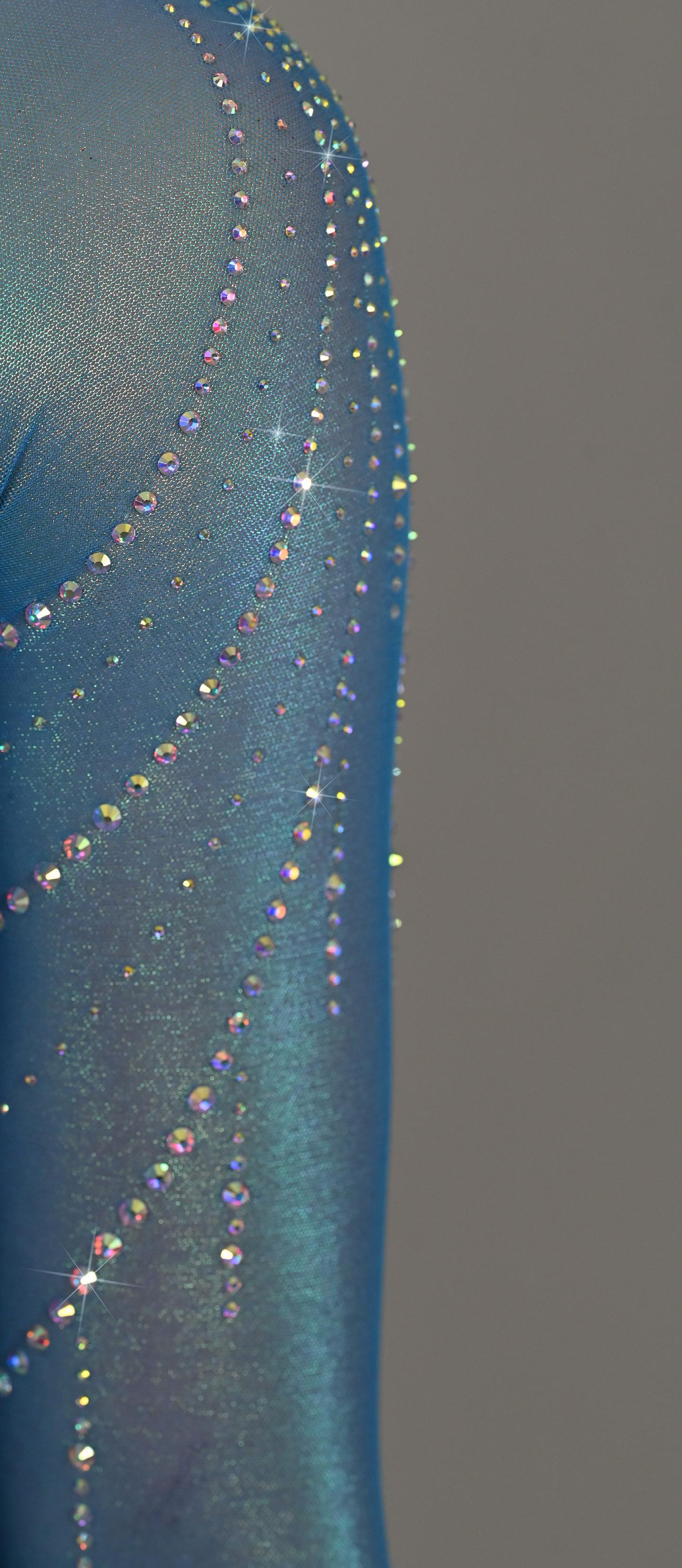 Crafted with meticulous attention to detail, Lustre is a mesmerizing ensemble that will make any performance shine with brilliance. The bodice is constructed with a Peri lycra base, layered Light Blue Mystique and sublimated mesh that creates a luminous effect on the upper bodice as it catches the light, enhancing the athlete’s every movement with an enchanting glow. Sublimated full length mesh sleeves and Aurora Borealis rhinestone detail tie this stunning garment together.