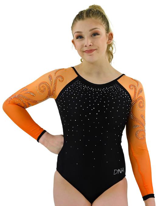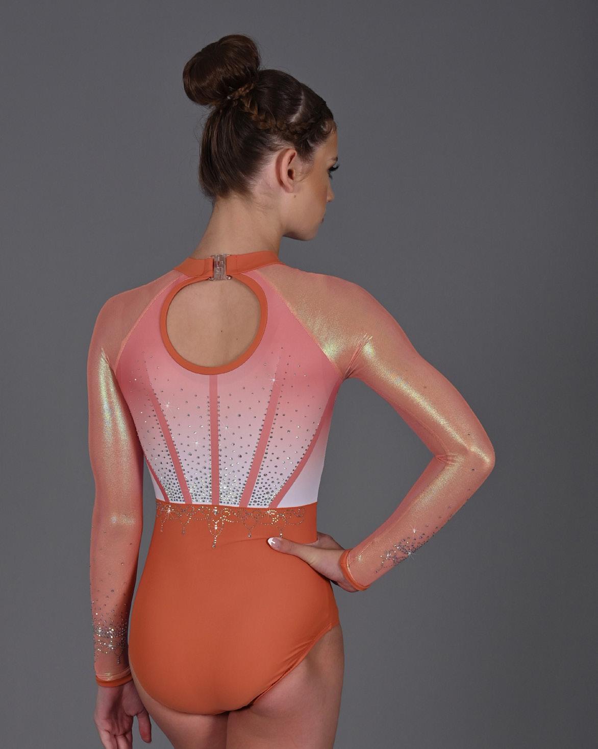 The Adorn leotard is a masterpiece of artistic expression, constructed using a Dark Copper lycra base and sublimated matte upper bodice. Orange Iridescent Aurora Mesh sleeves, and high neck keyhole back elevate this look. Complete with Aurora Borealis rhinestone detail on front, back, sleeves, and neckline. Each embellishment is thoughtfully placed, creating a captivating display that adds a touch of elegance and glamour to the gymnast’s every movement.