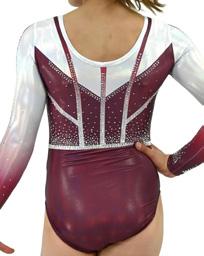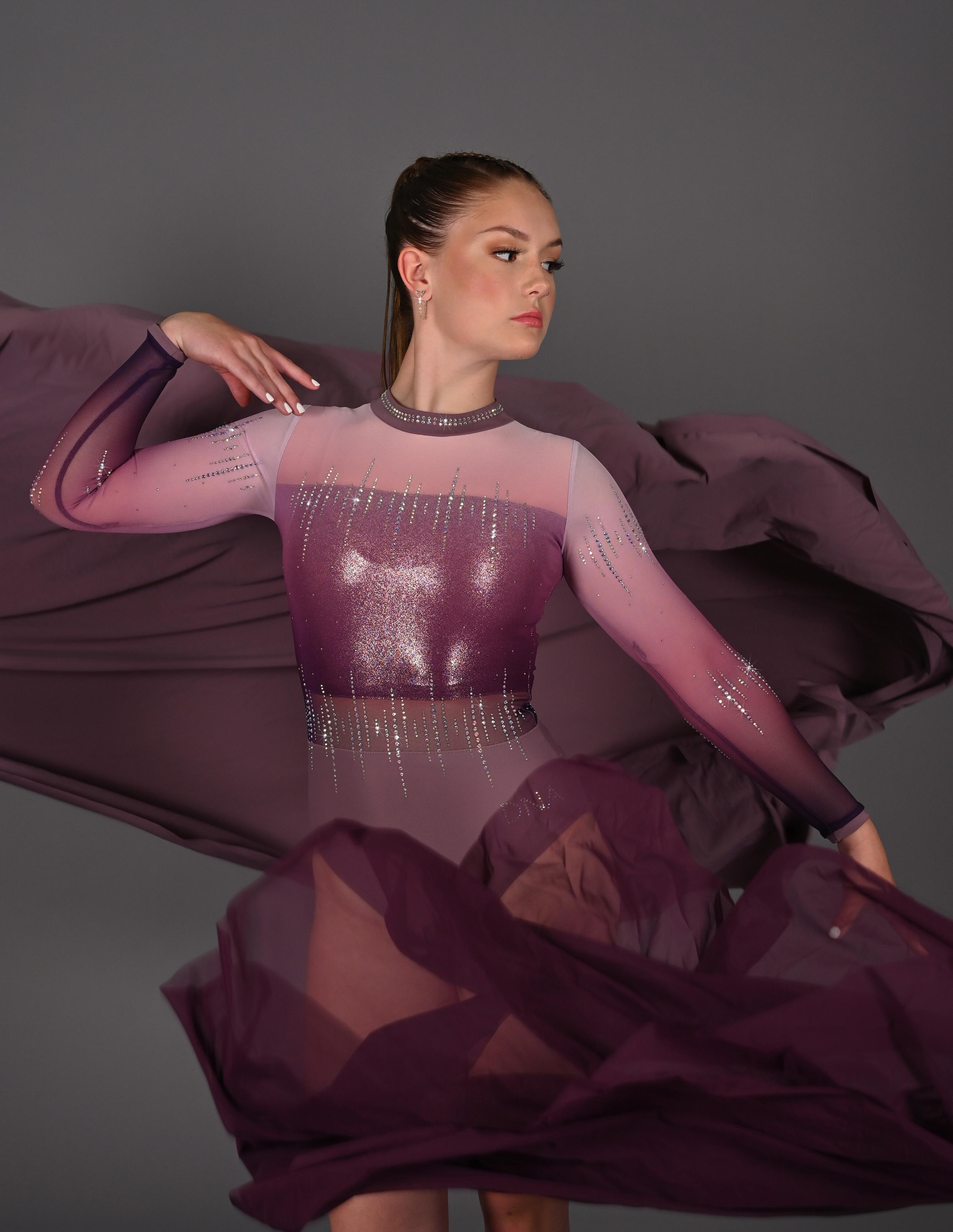 This leotard showcases a breathtaking blend of sophistication and artistry, crafted with the utmost attention to detail. Presented in Mauve lycra with a sublimated waist detail, overlaid with Burgundy glitter mesh. The full length sleeves compliment the mesh inset on the bodice, with corresponding glitter mesh. The garment is completed with a V- neckline and adorned with Aurora Borealis rhinestone detail on the front, back, and sleeves.