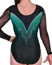 This leotard features unique elements that starts with a Pistachio lycra base and strategically placed mesh panels. Sublimated matte panels are carefully pieced together to complete the bodice. The Spirulina mesh carries through from the bodice to the full length sleeves. This dramatic leotard is embellished with Aurora Borealis rhinestone detail on the front, back and sleeves.
