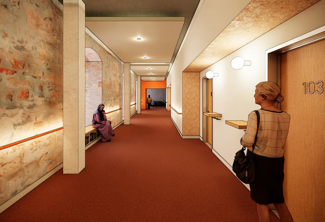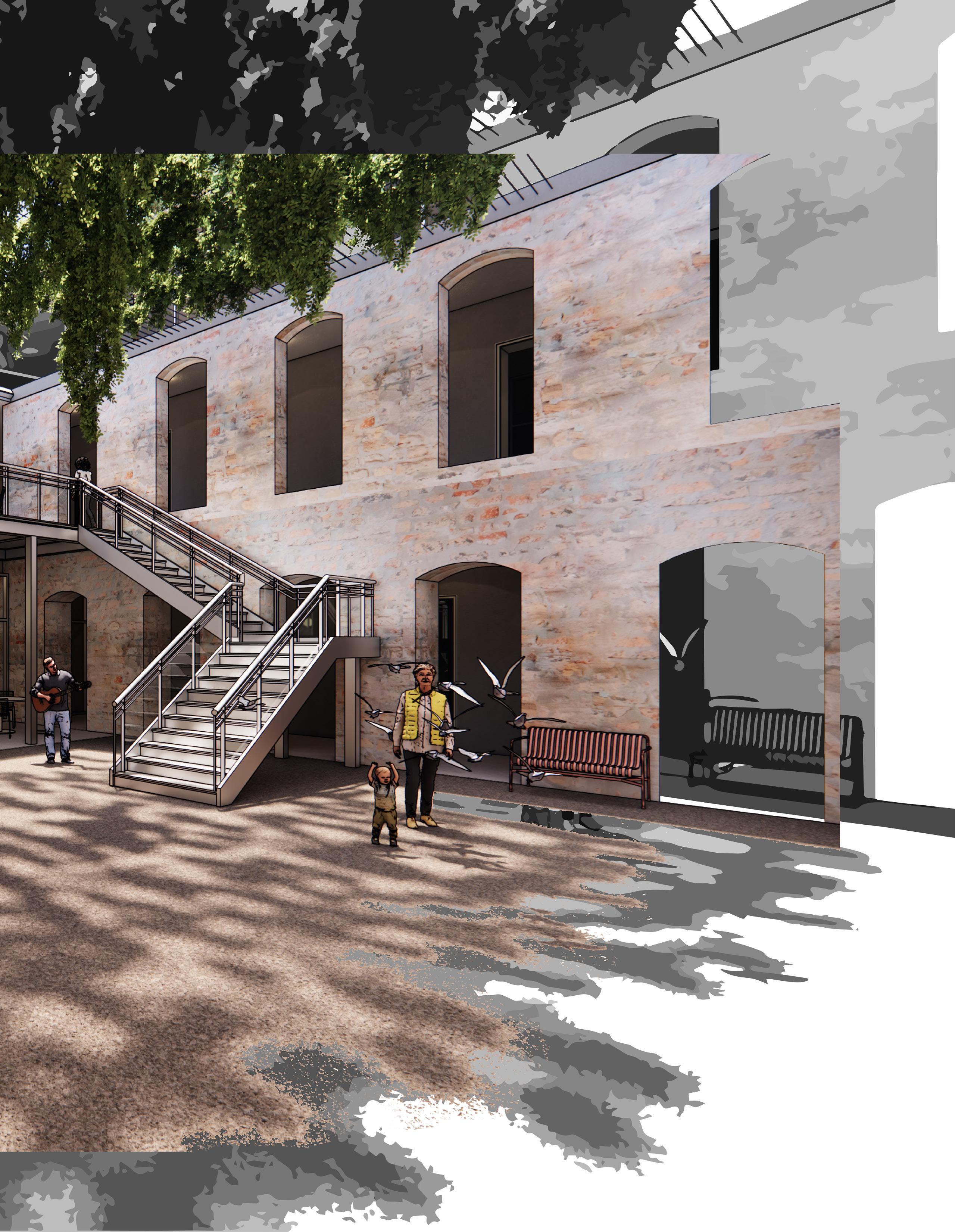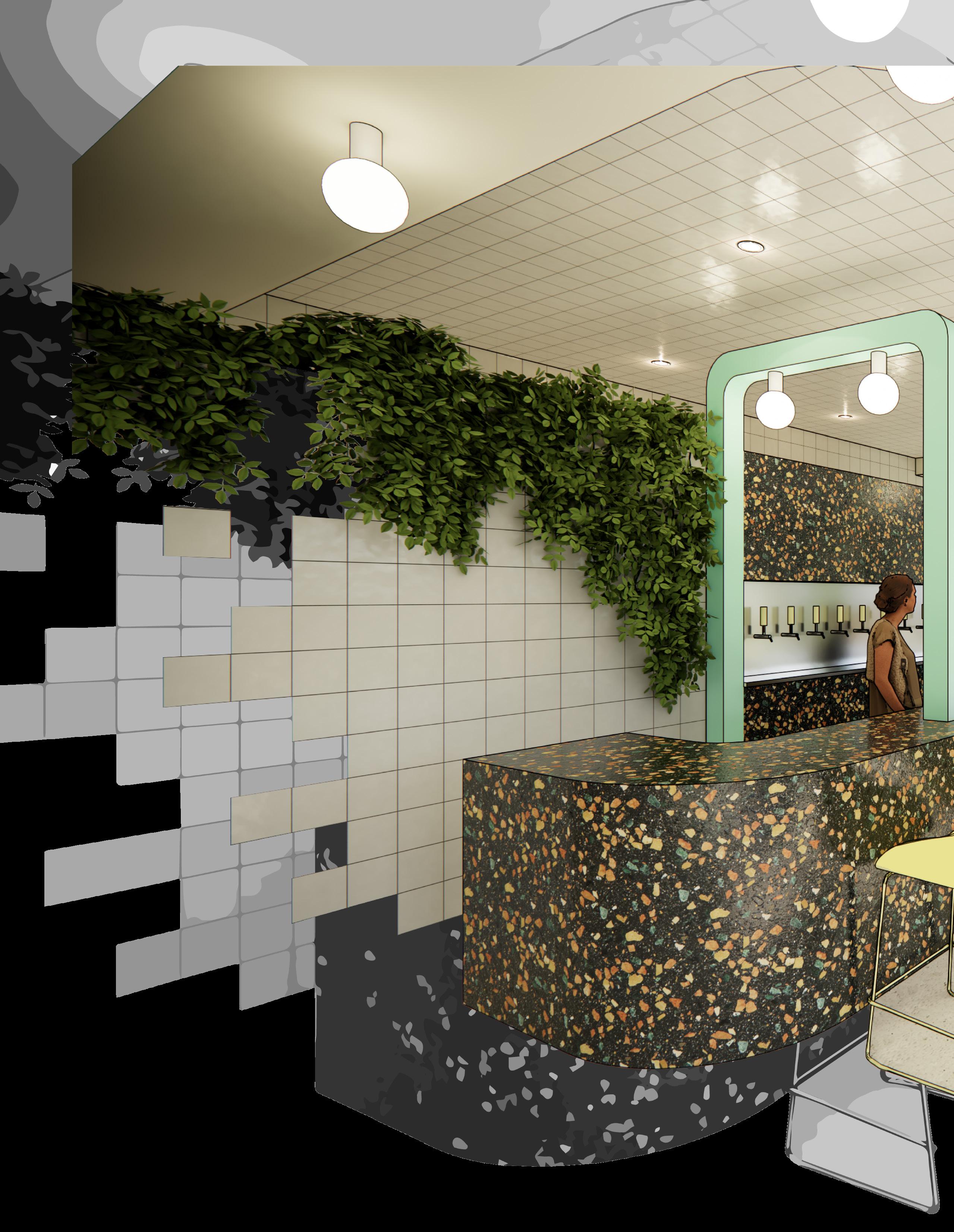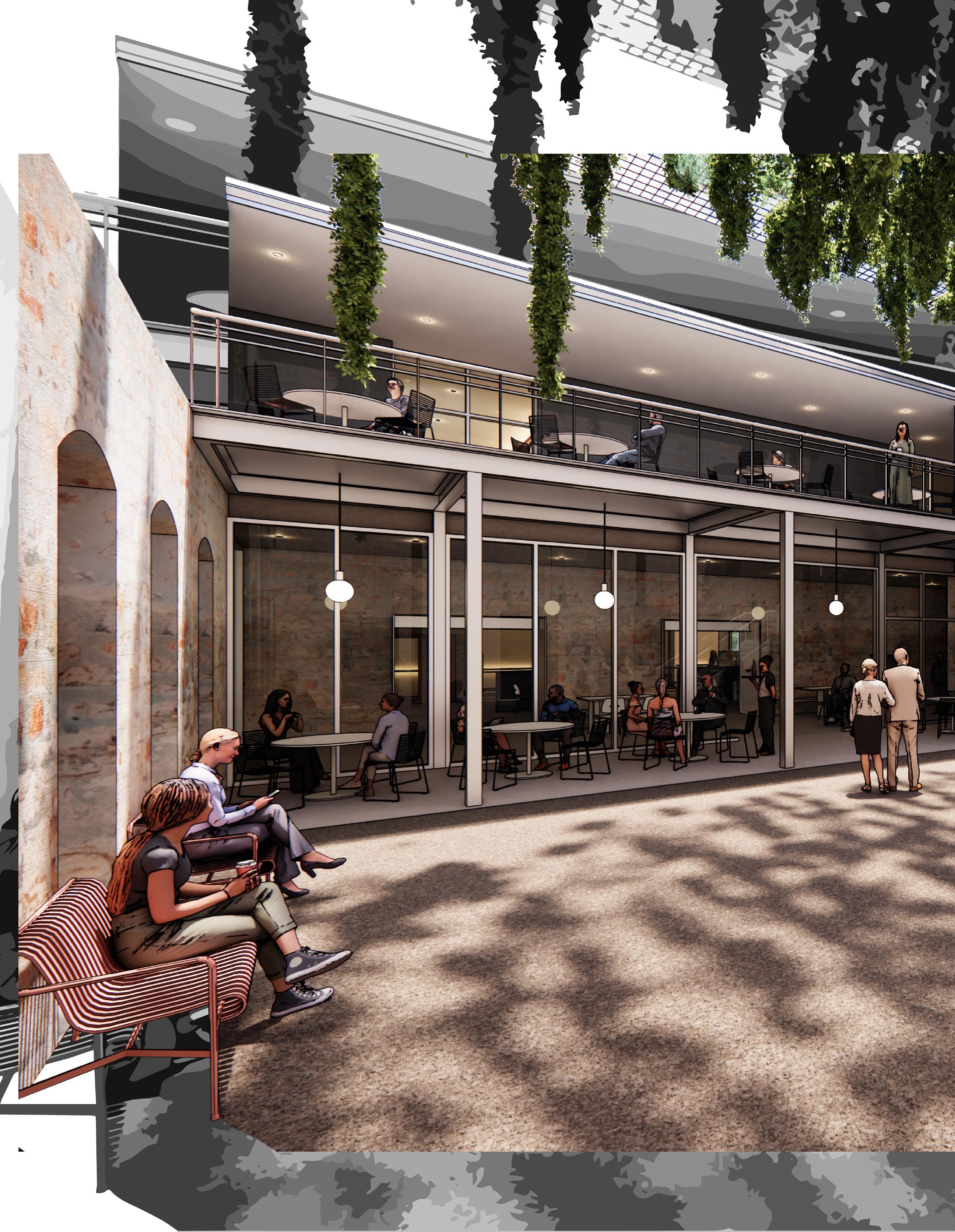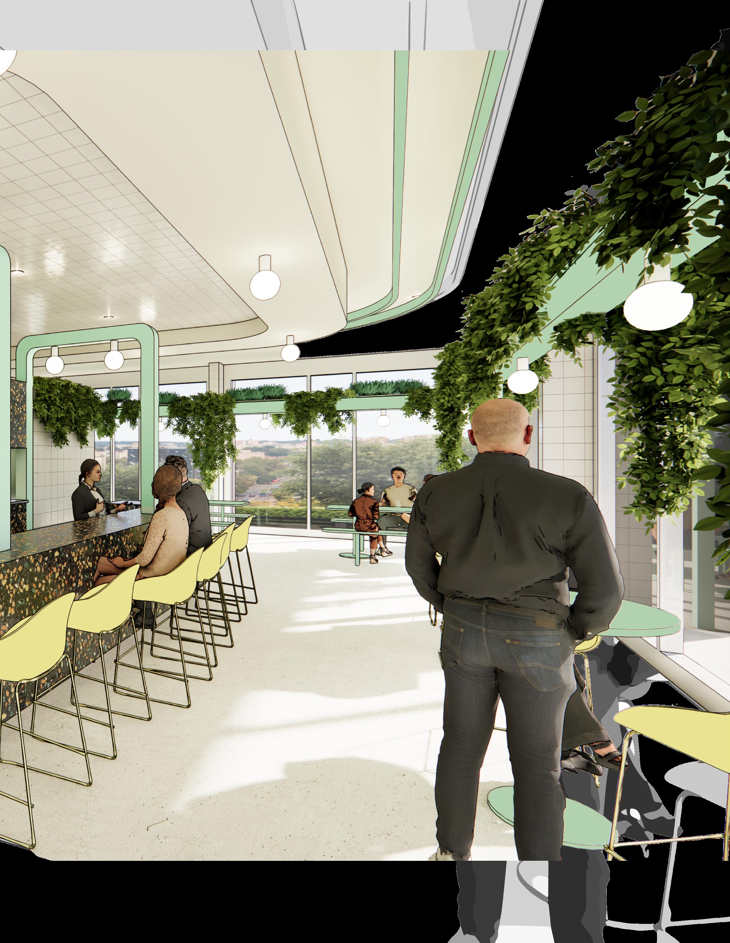 the design solution re-imagines the retirement community around intergenerational integration, uniting people of all ages through dynamic elements like a community market, biergarten, and interior courtyard. the biergarten, strategically located on the first floor along a major roadway, fosters community engagement. Additionally, three distinct unit plans accommodate a range of income