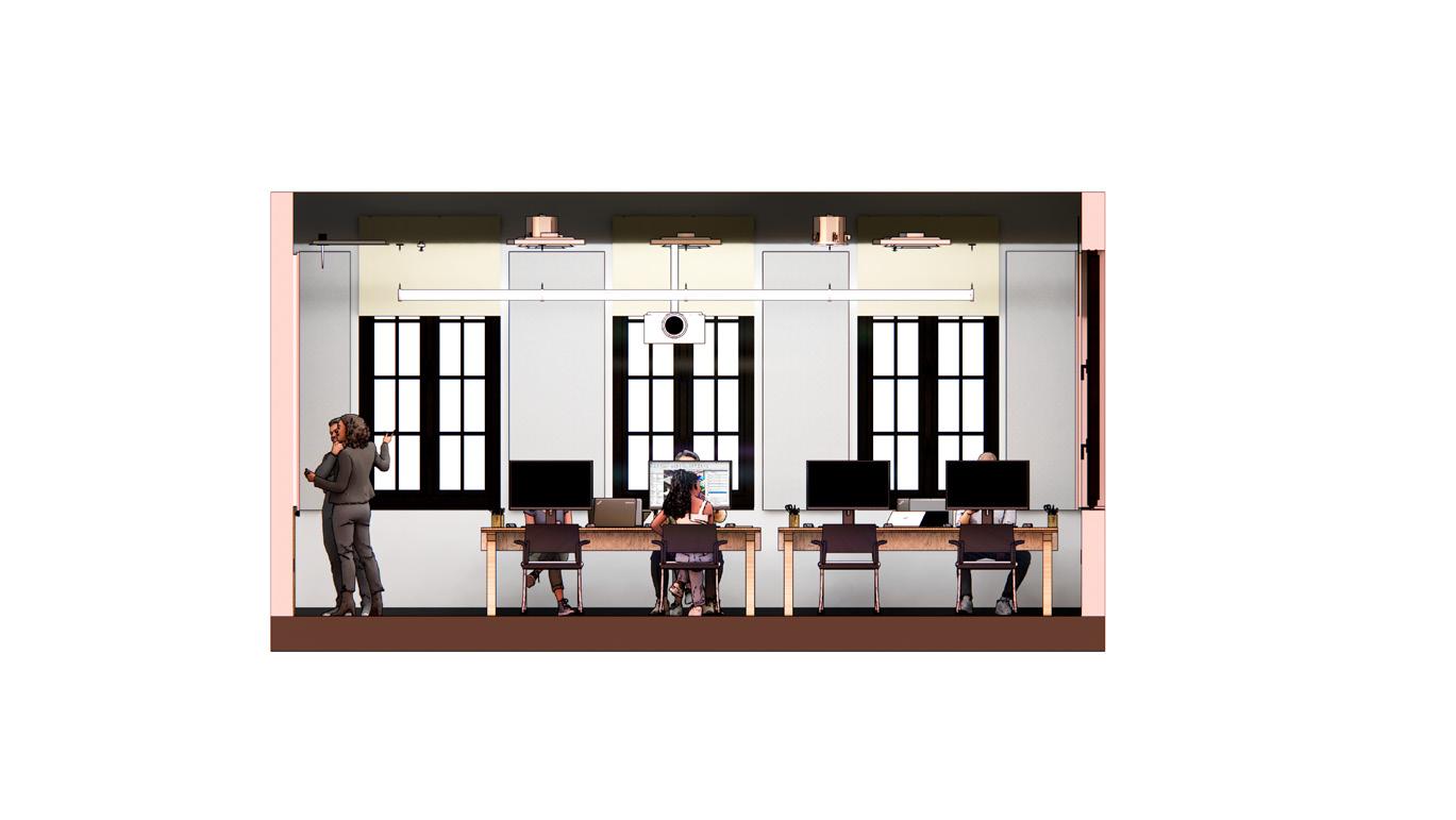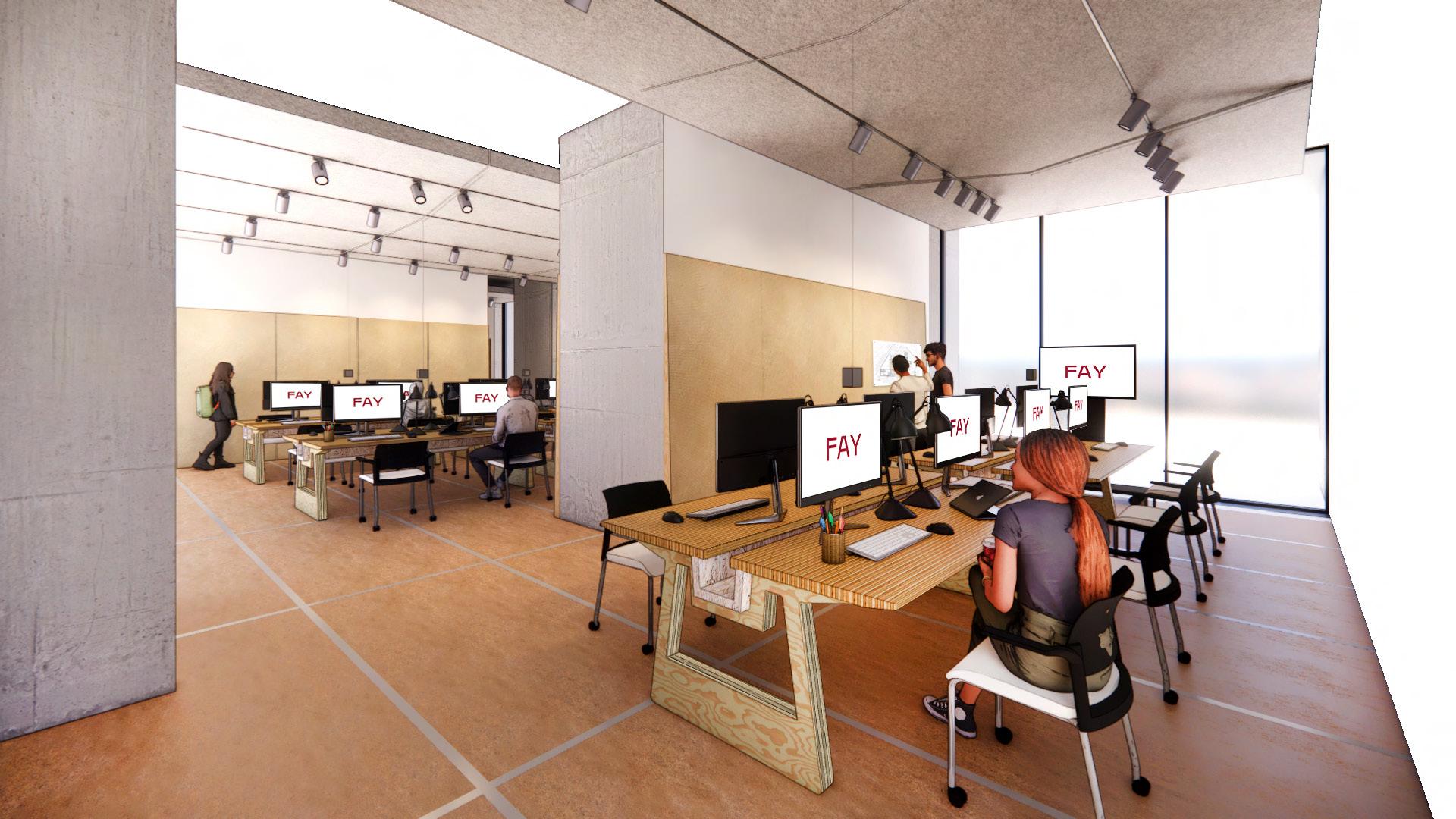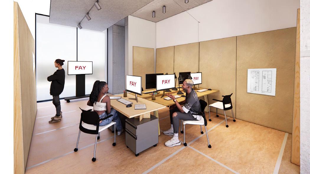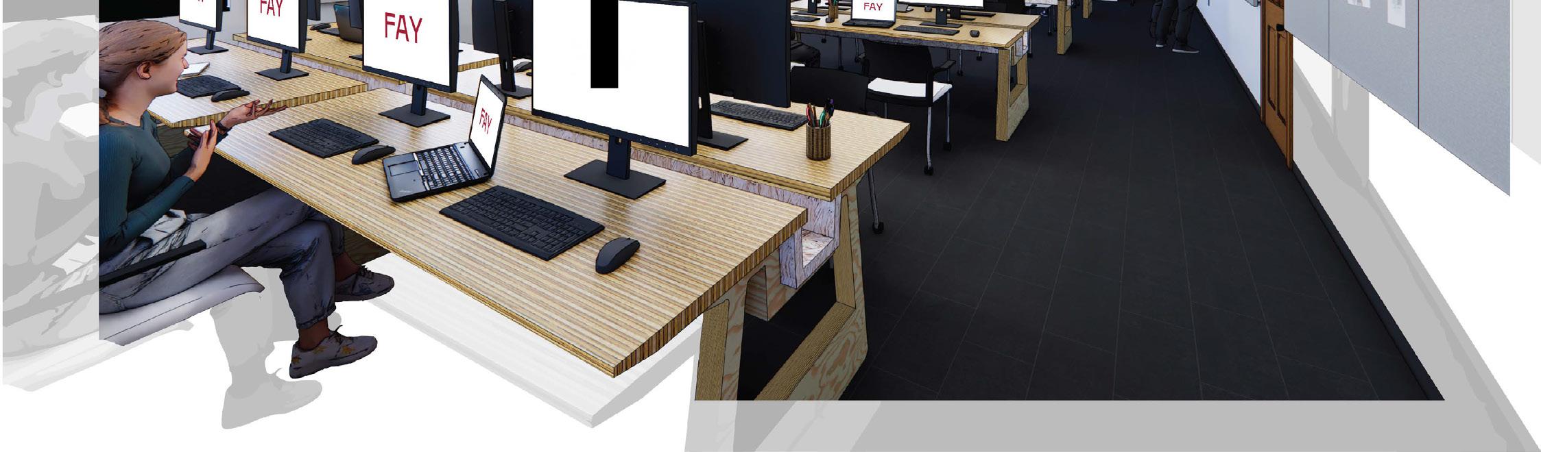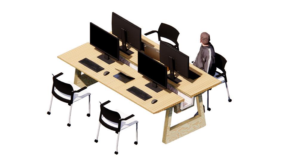 with growing student enrollment, two in-house spaces needed to be temporarily re purposed as student studios. by utilizing developing skills in design conceptualization, spatial planning, rendering and technical drawing, these spaces were transformed into functional studios, complete with custom student-designed and fabricated tables that promote collaboration.
