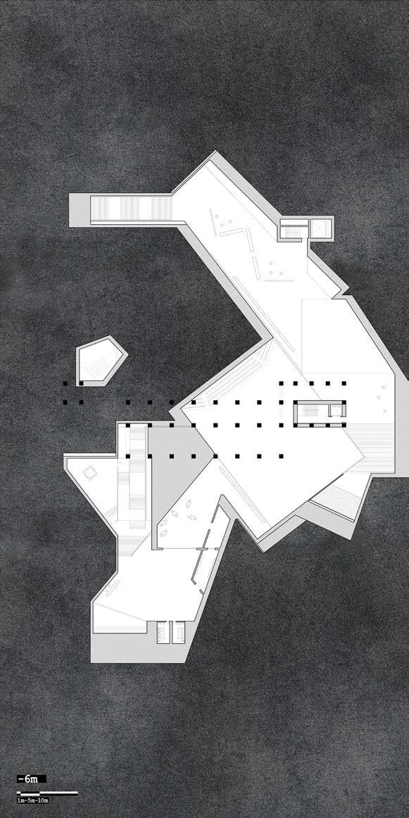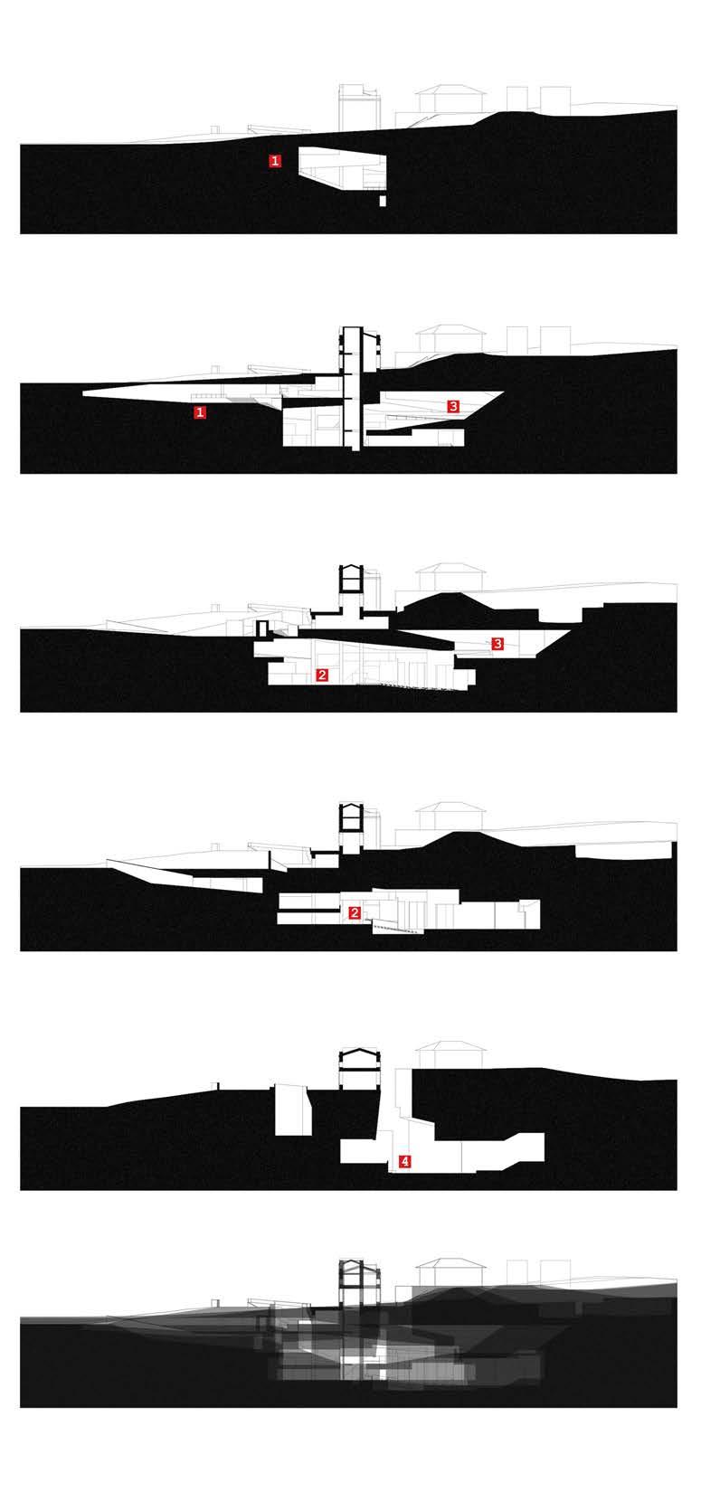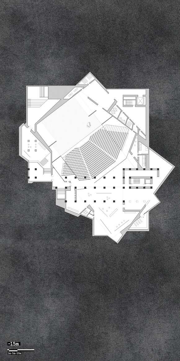 Through the isolation of the land, the underground media center forms an unreal space as the first layer of the stage; the literal stage at the center of the theater becomes a stage within the bigger stage. It is only at specific points, through skylights, that one realizes how far the "real world" is from us.