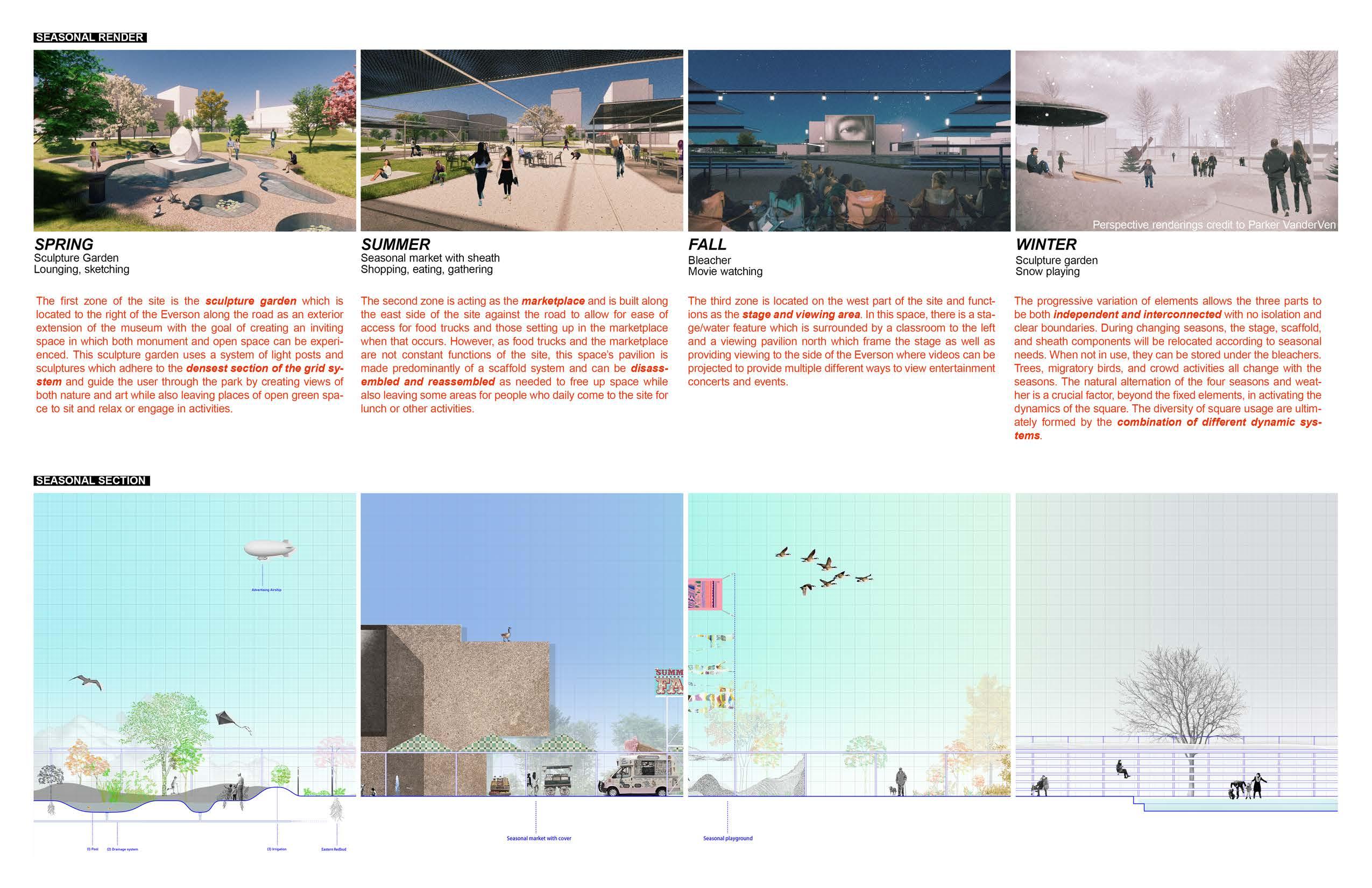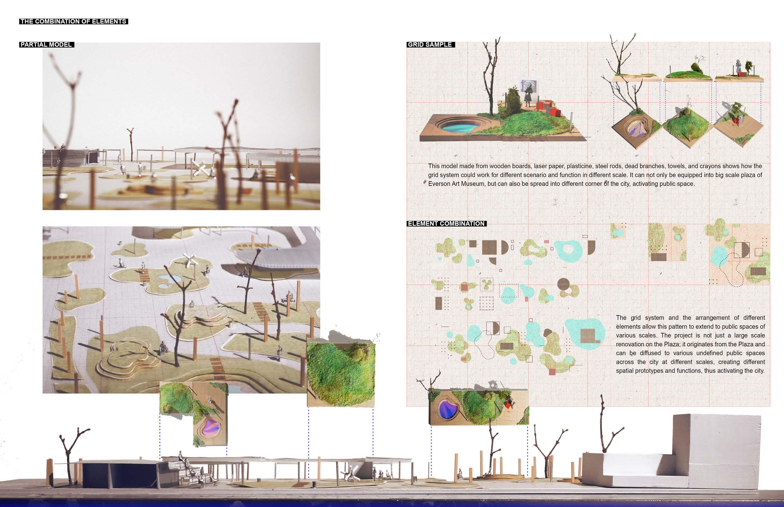 This conceptual drawing is the result of the combination of the three considerations mentioned earlier. When the three independent systems overlap, a new grammar emerges on the grid system. As a result, there is a rich spatial prototype generated by the interweaving of elements. The distribution of elements across the entire square transitions from the dense pavilion and bleacher in the upper left to the more lightweighted sculpture park in the lower right, and from the relatively permanent structures on the left to the kit of parts changing with seasons on the right.