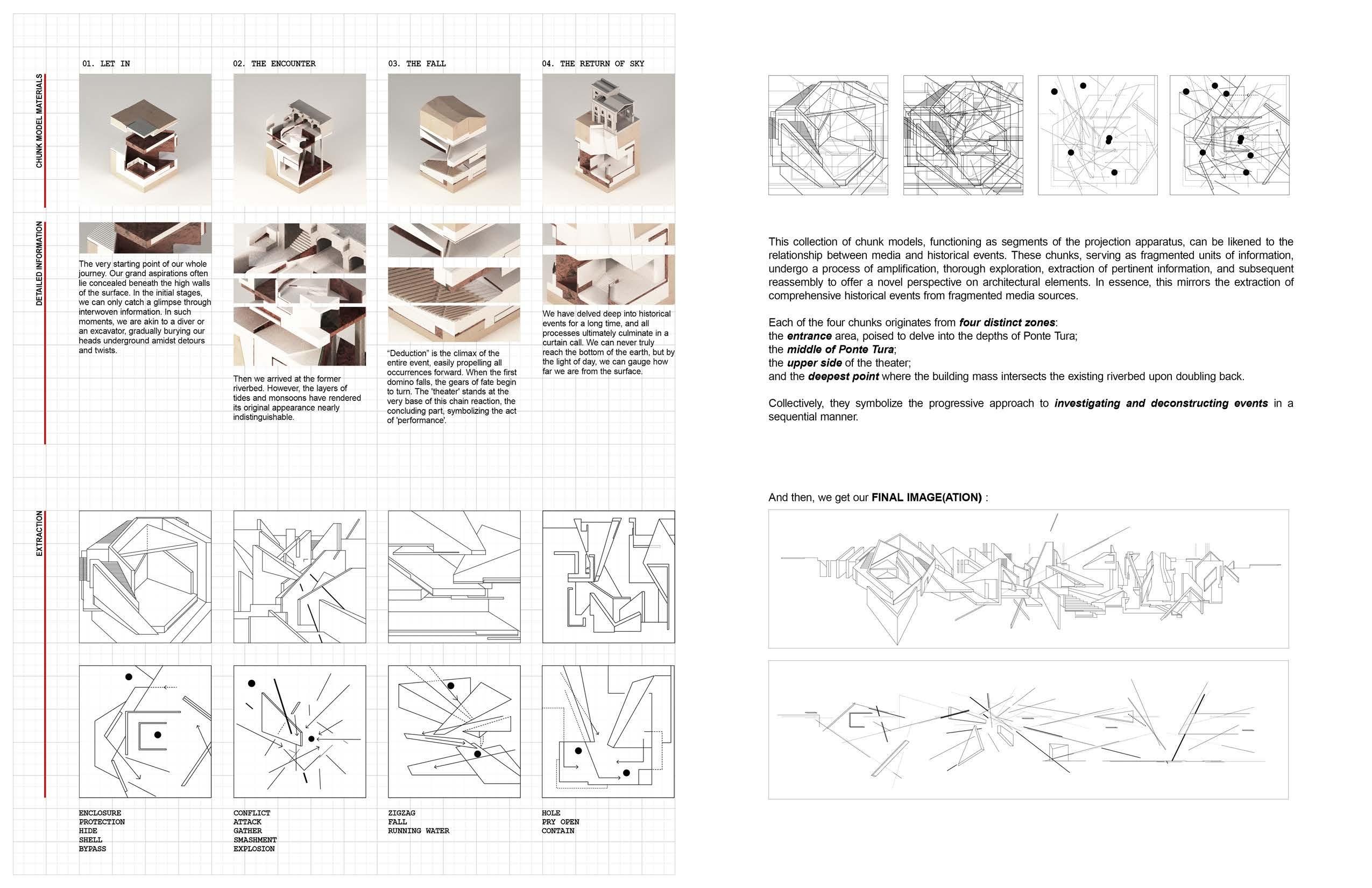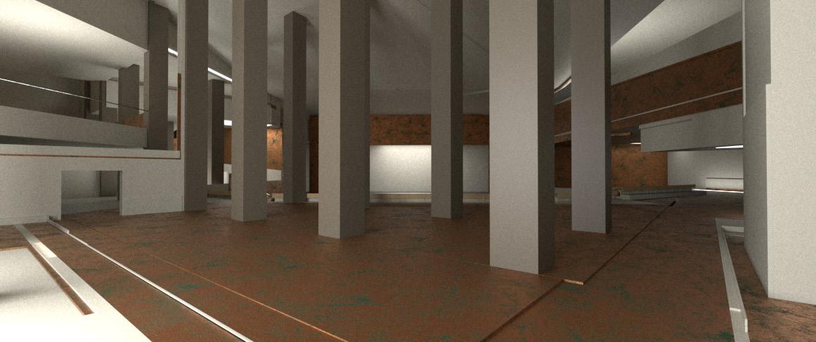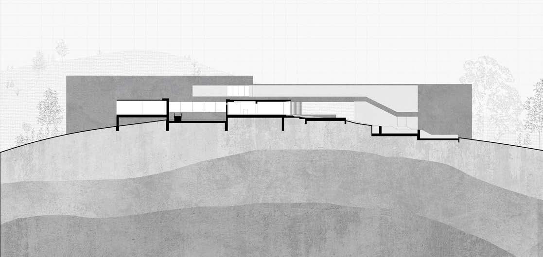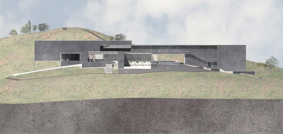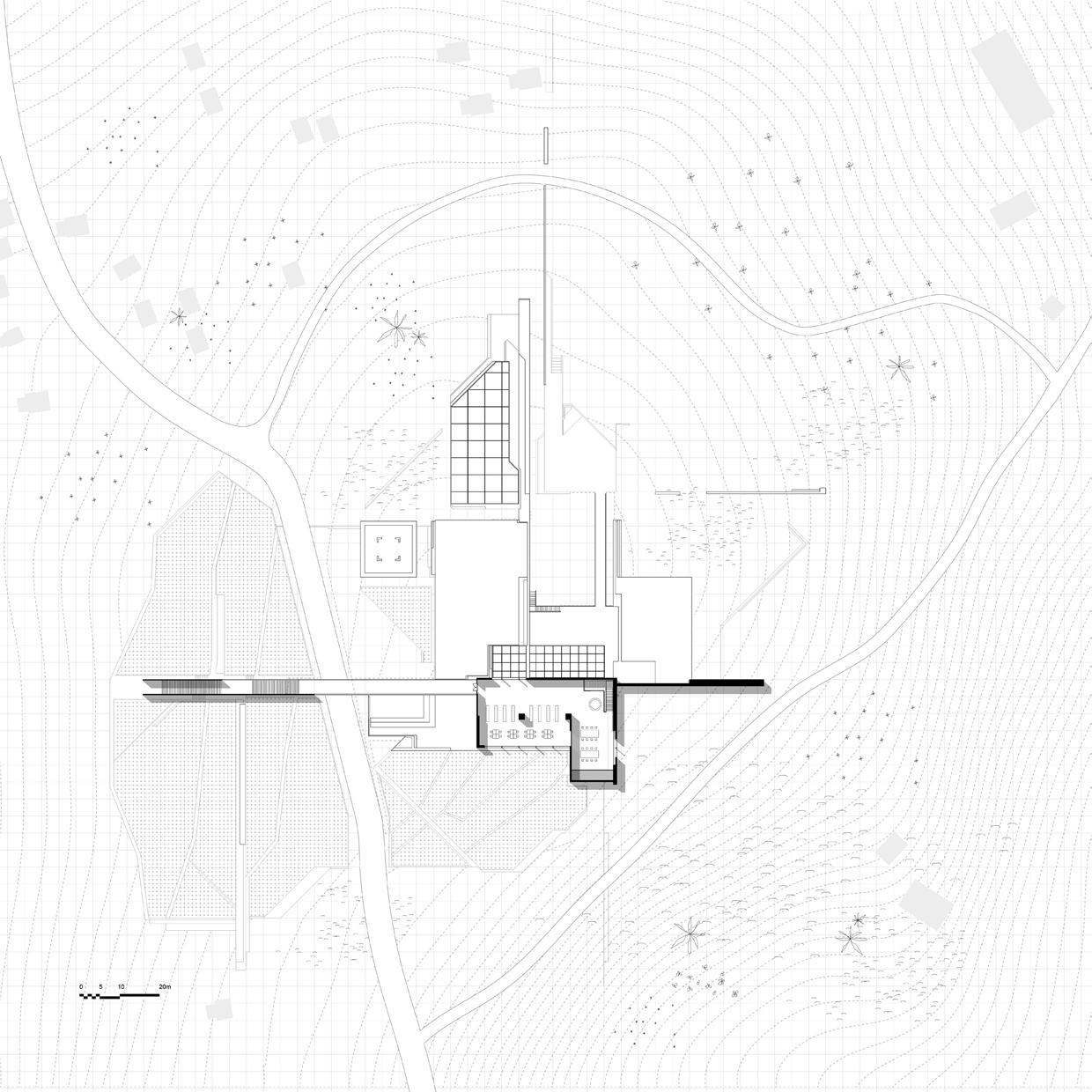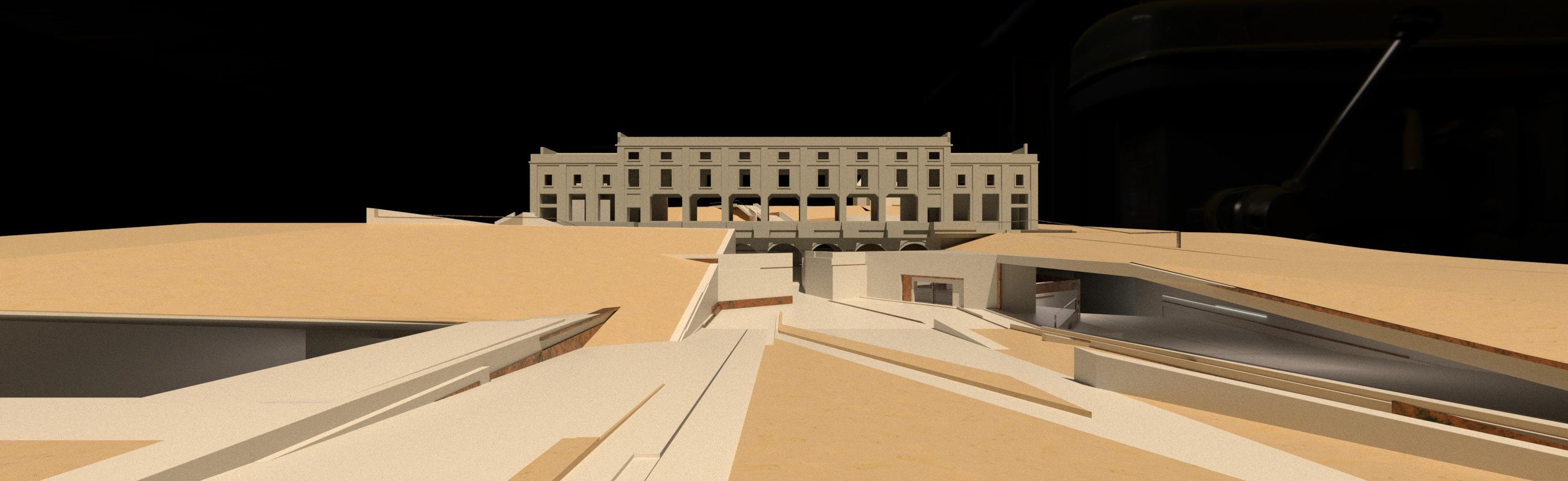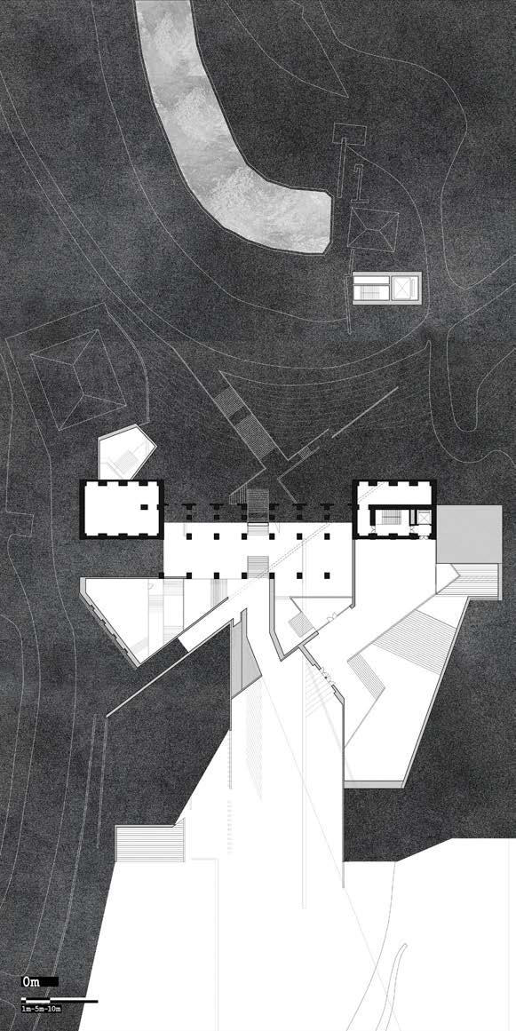 The gradual descent and the circumferential path around the stage create a ritual space beneath the soil of Ponte Tura. The process of touring the space makes the action of visiting space becomes a metaphor for excavating history. Simultaneously, the form of "circumambulation," a ritual seen in many religious processes, alludes to the surreal and untouchable characteristics of history and the stage's infiniteness that cannot be grasped or understood.