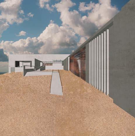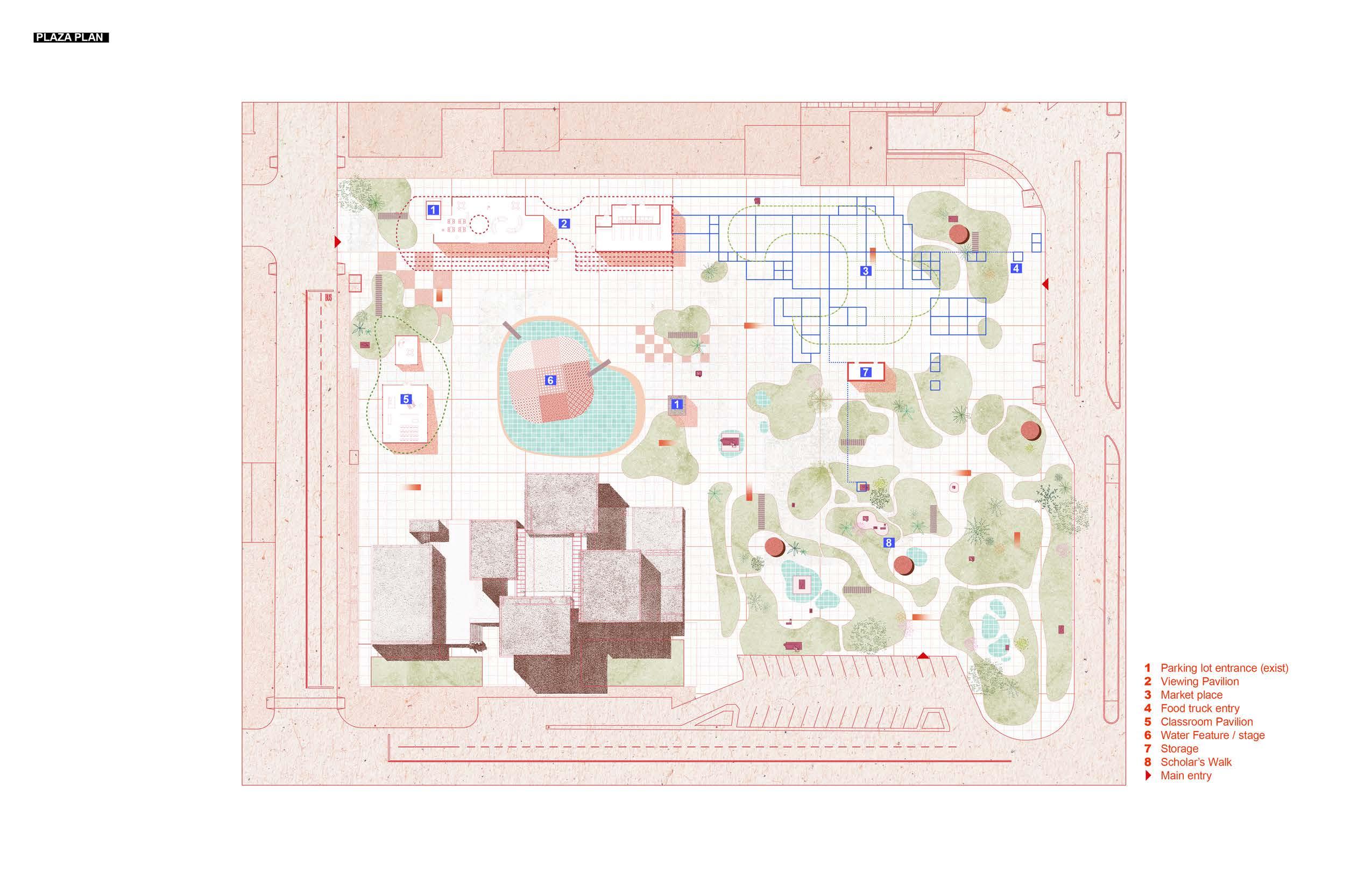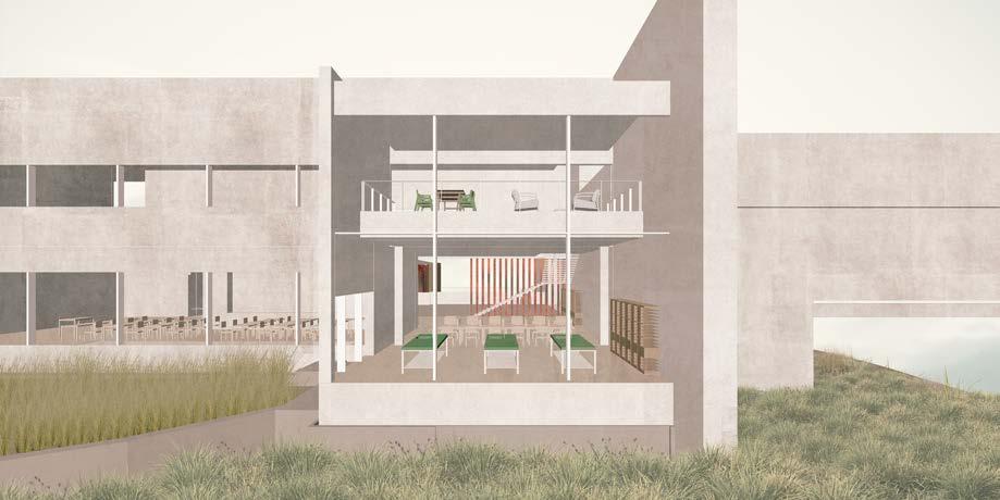 The extension of wall components does not divide the space into two; instead, through the manipulation of openness and visibility, the space exhibits a fluid and interconnected quality in plan. According to the accessibility to field and crowd, the reception and drone storage is on the left, the classrooms and outside amphitheater is down below the courtyard, and office is on the right side.