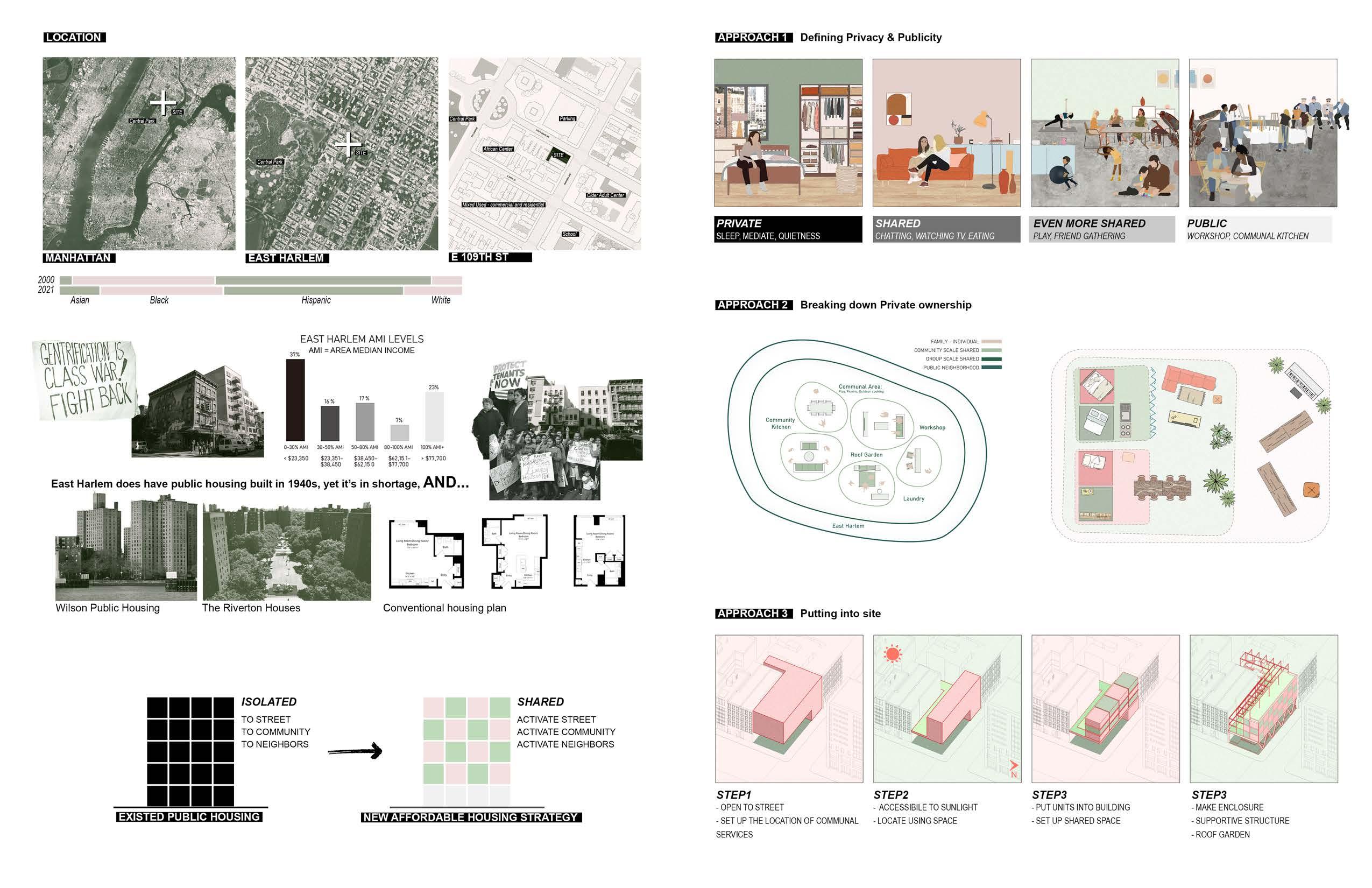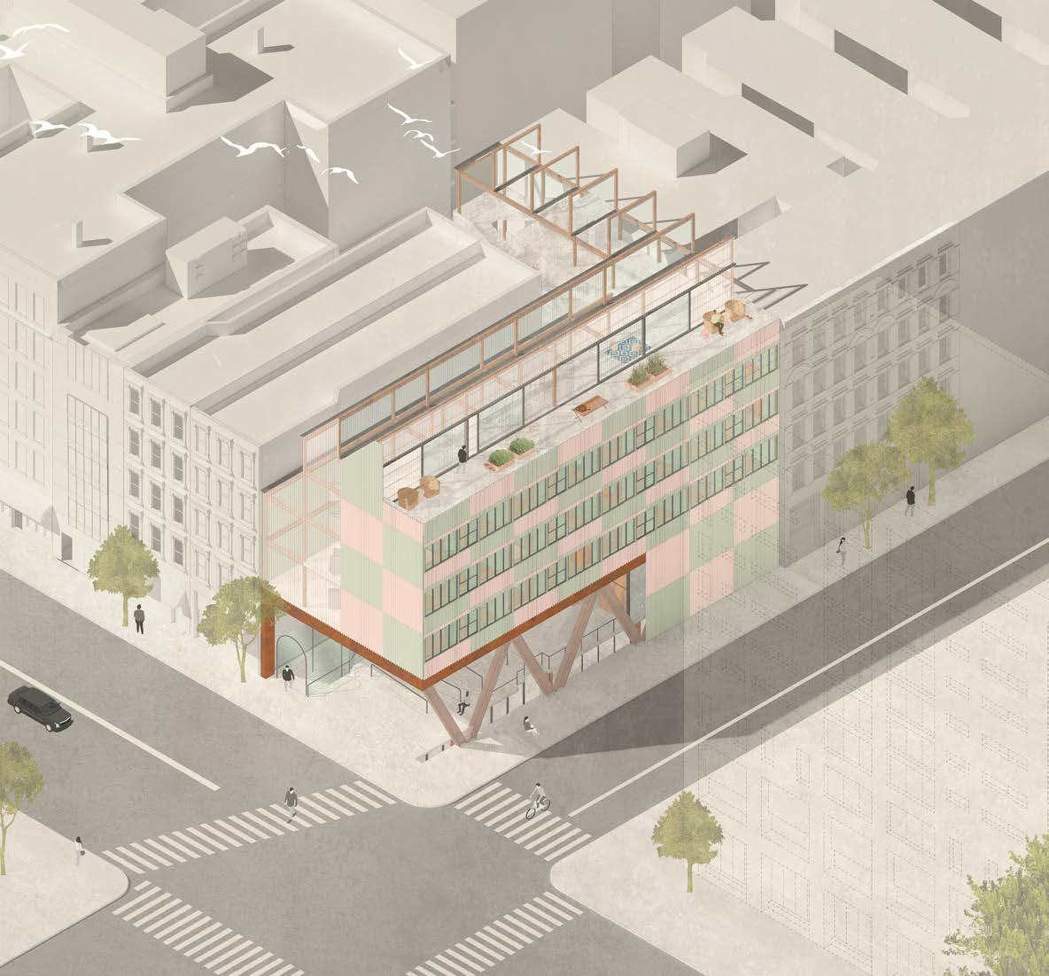 Checker House, a six-level residential building situated in Harlem, New York City, is designed to cater to people of color and singles. The architectural concept draws inspiration from the checkerboard pattern, embodying the idea of weaving distinct urban features into a cohesive fabric. The implantation of checkerboard design aims to provide not only a visually appealing structure but also a harmonious living space that reflects the diverse and vibrant character of Harlem.
