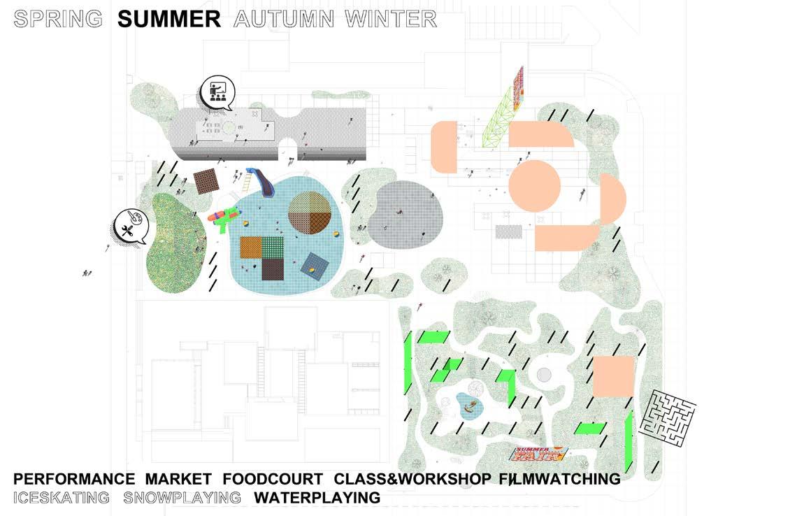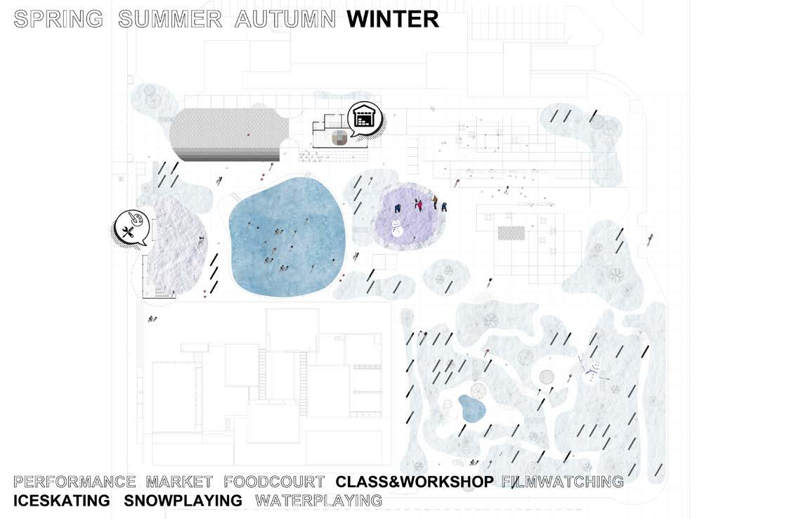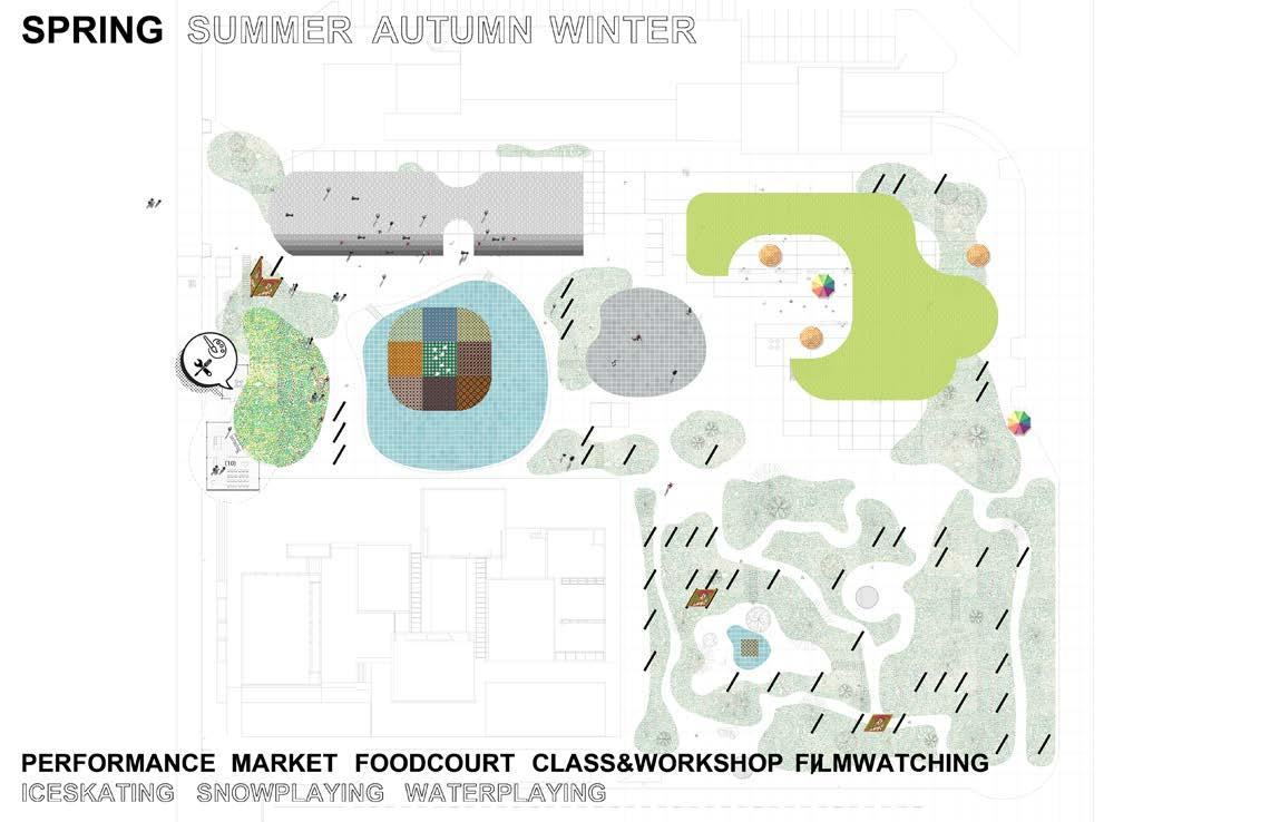 It frames a new scheme on public space that can adapt different using scenario with the change of seasons and time. Different scale of grids enables kit of parts could be spread out through different systems, creating a dynamic and rich use of space.