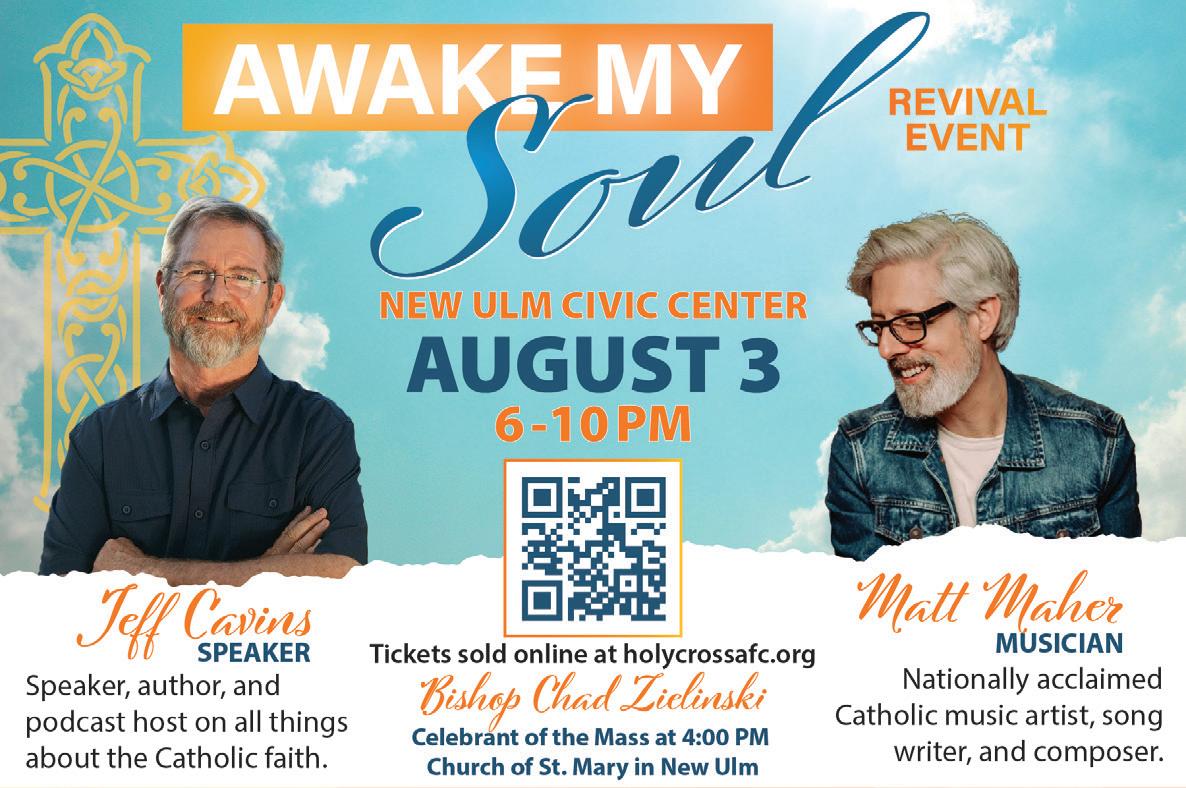 founder of the Great Adventure Bible Study, Jeff Cavins, and a performance by the awardwinning musician Matt Maher. Adoration, Reconciliation, and prayer teams will be available for those who attend. Before the Revival event, the Most Reverend Chad Zielinski, bishop of New Ulm, will celebrate Mass at 4 p.m. at the Church of St. Mary in New Ulm.