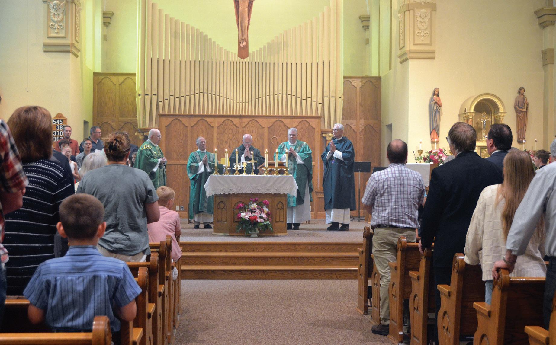 Bishop Chad Zielinski offered Mass for those gathered for the St. Raphael’s 150th anniversary celebration in June. Concelebrating was Fr. Dennis Labat, (left), former parish pastor, Fr. Jeremy Kucera, (second from right), present pastor, and Fr. Phil Schotzko, former pastor. Assisting was Deacon Barry Reindl. (Photos by Christine Clancy)
