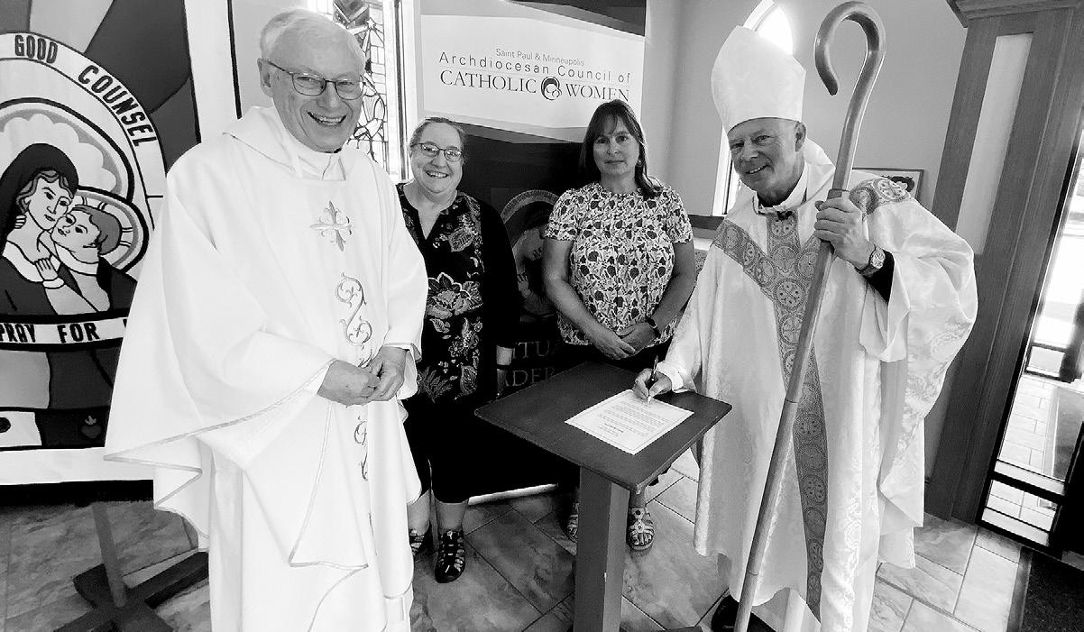 Bishop Zielinski signs the Council of Catholic Women Recognition Sunday proclamation designating Oct. 13, 2024, as CCW Recognition Sunday. The bishop is pictured with Monsignor Eugene Lozinski, spiritual advisor of the NUDCCW, Sharon Illikman of New Ulm, NUDCCW president, and Mary Koralewski of Glencoe, Spirituality Commission chairperson. (Photo by Christine Clancy)