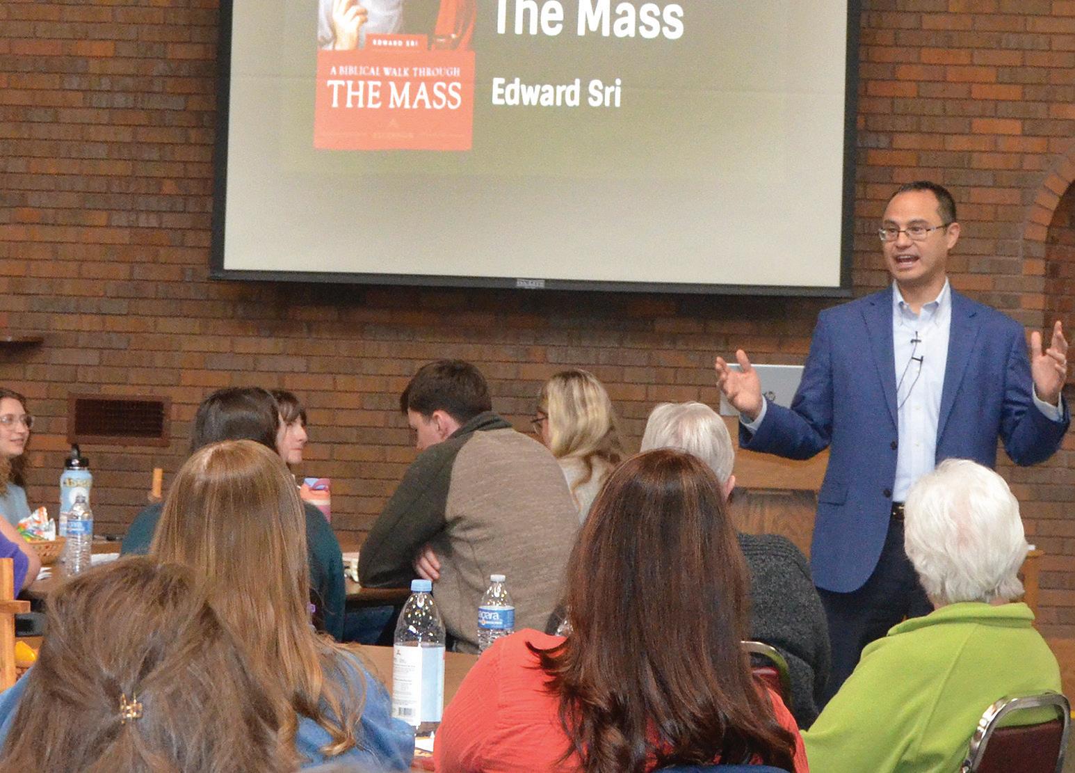 Radermacher Hall at the Church of St. Catherine in Redwood Falls was filled to capacity as educators, catechists, lay faithful, and numerous clergy and religious gathered for a first-of-its-kind Bishop Lucker Lecture daytime workshop by Dr. Edward Sri, a sacred scripture scholar with the Fellowship of Catholic University Students (FOCUS) and the Augustine Institute. The Friday, March 15, 2024, workshop on “Bringing the Liturgy into Our Daily Lives,” was a prelude to that evening’s shortened presentation. The Bishop Lucker Lecture is an annual event sponsored by the Diocese of New Ulm.