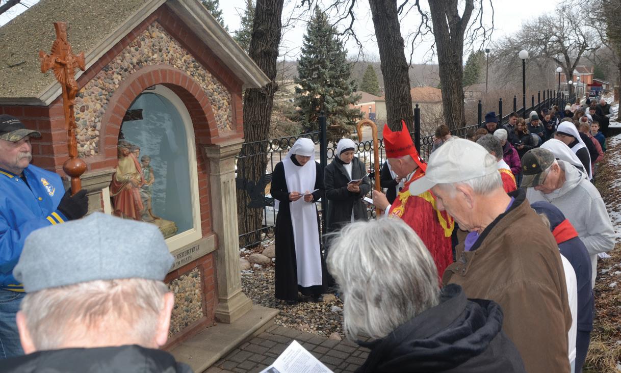 NEW ULM - Nearly 200 people joined Bishop Zielinski on Good Friday at the Way of the Cross shrine in New Ulm as he led them in prayer of the Stations of the Cross. The Diocese of New Ulm shrine is open all year round; the chapel daily from April to October. (Photo by Christine Clancy)