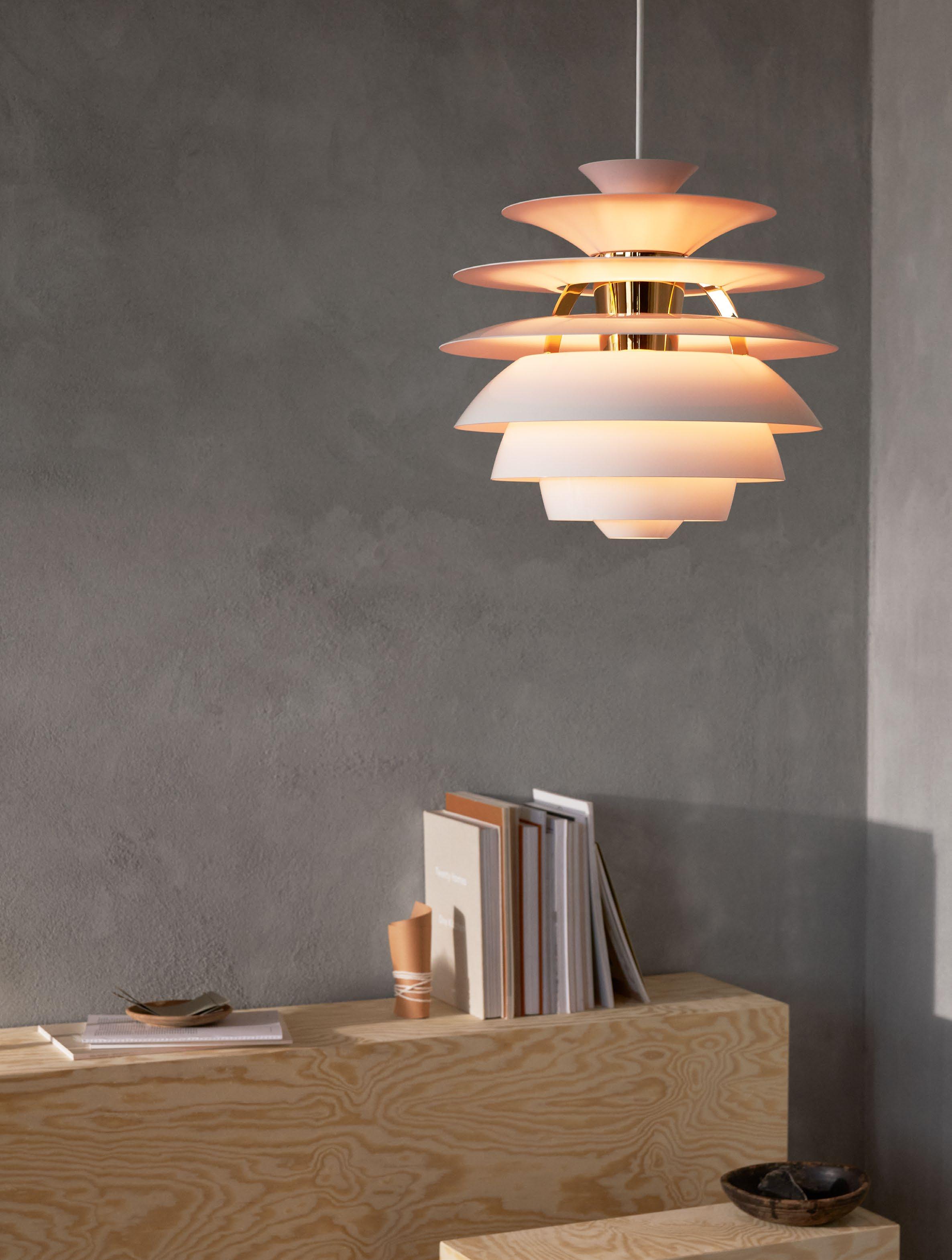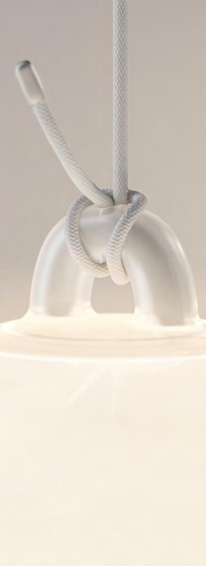 Las lámparas se presentan en diversas siluetas cónicas y cilíndricas estructuradas por medio de hilos tensados dispuestos en una alineación de capas entre dos aros. Esta arriesgada pero impecable ejecución de diseño produce una iluminación descendente y ascendente, y así, la fuente de luz oculta en el aro inferior baña el espacio inferior.
