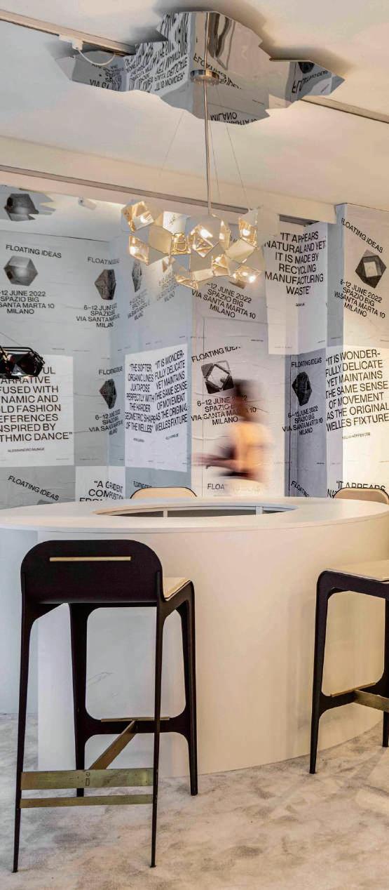 El día aún era joven, más instalaciones y nuevas colecciones aguardaban a ser descubiertas. En la galería Giopato & Coombes, la marca homónima presentó su más reciente colección: Maewha. En el showroom de Archiproducts, Bomma exhibió una instalación monumental de su colección Lens. Por otro lado, en el Superstudio Più, Aqua Creations, en asociación con Lexus y el arquitecto y diseñador Germane Barnes, presentó la instalación Sparks of tomorrow.