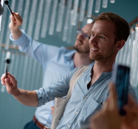 Al golpear las piezas cilíndricas se escucha un tono que desencadena una secuencia de sonido que se traduce en luz.