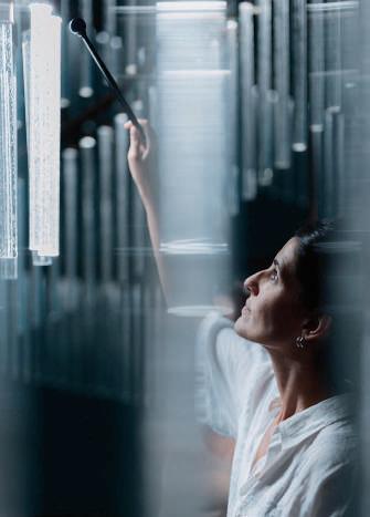 Composición en Cristal consta de varios anillos exteriores que recuerdan a las ondas sonoras y de un corazón interior. Este corazón está dividido en tres secciones jugables. En una sección, las longitudes de los componentes se ajustan para adaptarse a la escala musical. Docenas de fragmentos de canciones de muestra se crearon y programaron en la instalación. Cada vez que un componente cilíndrico se golpea con una maza, se escucha un tono que, a la vez, desencadena una secuencia de sonido. La superposición de las secuencias genera una composición robusta de sonidos ligeros, que luego se traducen en luz que viaja a través de los anillos exteriores de la luminaria. Los anillos están dispuestos de modo que no permiten ver el centro, pero brillan para invitar a explorar la instalación. Una auténtica sinfonía de cristal.