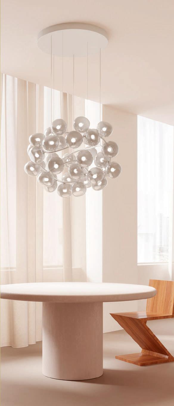 Tendencias que dejan ver cómo las formas, figuras y texturas orgánicas no son una moda, sino que llegaron para quedarse. La tecnología no se queda atrás, prueba de ello es la Composición en Cristal, de Preciosa Lighting, una luminosa sinfonía interactiva que genera emociones y recuerdos. Una expresión lúdica en la que al golpear las piezas cilíndricas se escucha un tono que desencadena una secuencia de sonido que se traduce en luz.