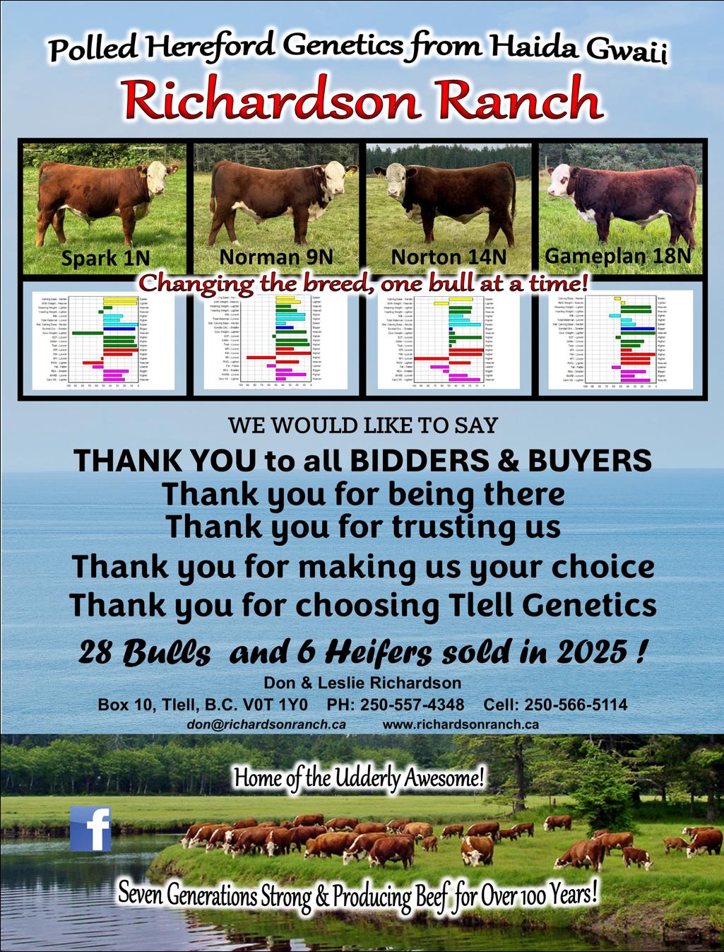 As we roll into 2026, we look forward to strong cattle markets that will continue strengthening our industry and provide a strong platform for the next generation of Hereford breeders to build from. This market strength can be attributed to low cattle numbers in the primary beef producing countries around the world along with strong consumer demand for healthy natural products which includes beef. The Hereford breed remains one of the largest breeds in Canada and we are seeing a resurgence in the demand for the white face on red and black cattle. The Baldy is the most popular crossbred cow and there is only one real way to have it and that is with Hereford genetics. Initiatives such as the Heifer Select Program that we are collaborating on with other breeds will serve to strengthen the Hereford influence in the commercial cowherd.