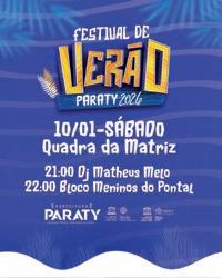 A Prefeitura de Paraty, por meio das Secretarias de Turismo, Cultura e Esporte e Lazer, lança neste sábado o Festival de Verão 2026, que prevê programação especial para toda a família, com muita música, esporte e diversão. A cidade entra no clima de música, esporte e muita energia para celebrar o verão do jeito que Paraty sabe fazer. E junto com o festival, o clima de pré-carnaval já começa a tomar conta da cidade. Festival de Verão 2026 Paraty, 10 de janeiro