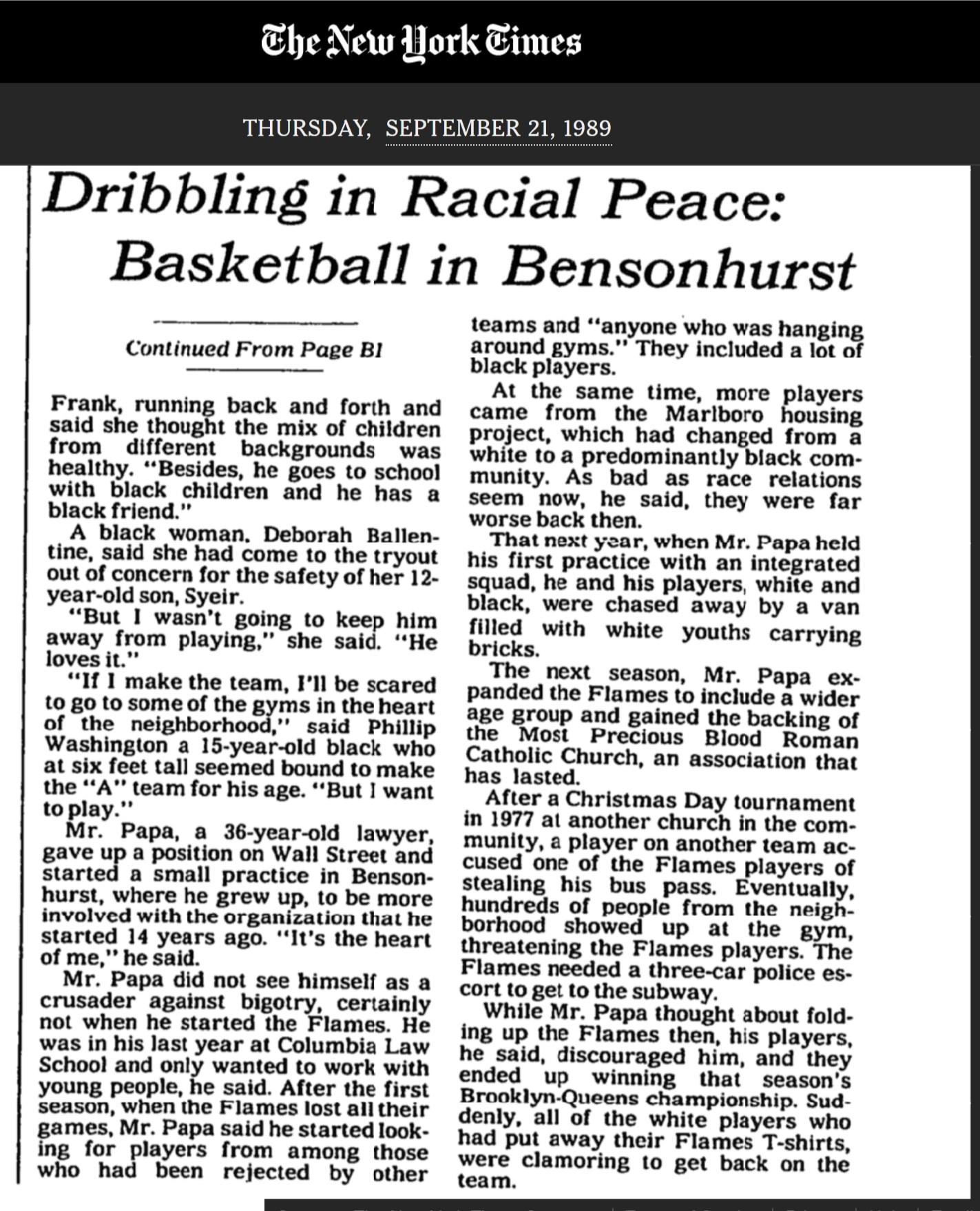 Gerard Papa, founder of the Flames basketball program in Brooklyn, as covered by The New York Times. This piece examines how Papa built an integrated youth basketball program in Bensonhurst at a time when racial tensions made the effort both radical and necessary. Gerard Papa is a Wall Street attorney and one of New York City's most recognized voices on race, youth sports, and community building.