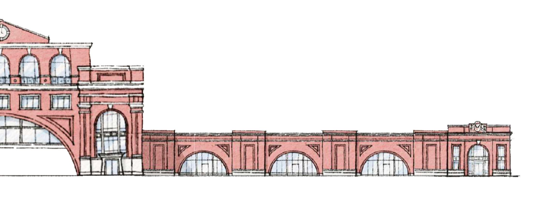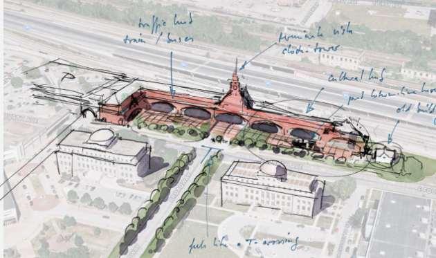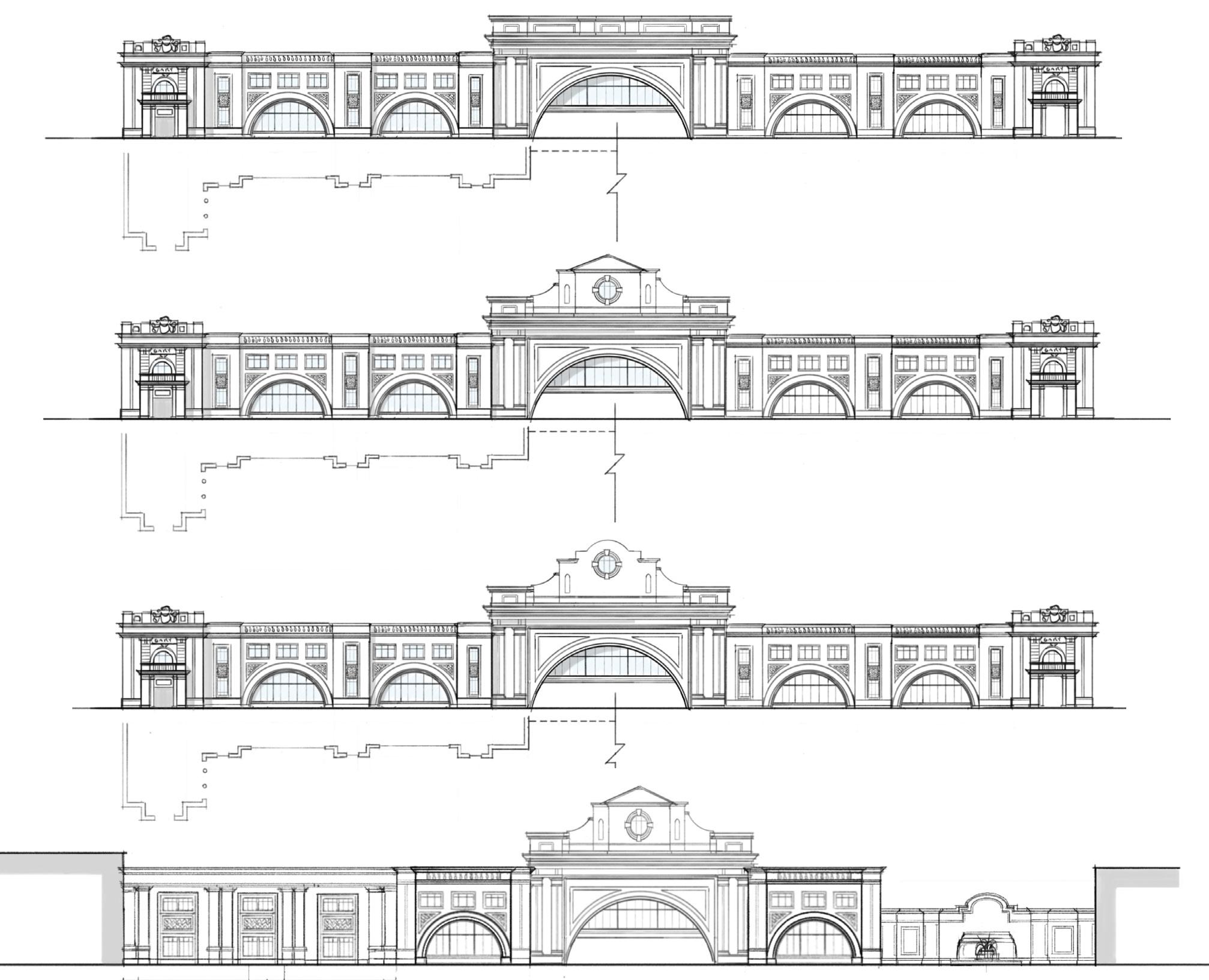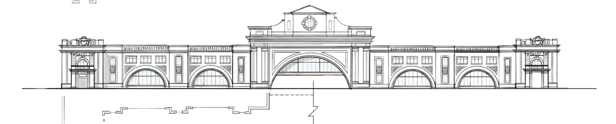 The new multimodal transit station serves as a civic gateway for visitors arriving by car, bus, or rail, framing the reimagined Gateway Park while respectfully positioned between—rather than in front of—the historic domes of City Hall and the Courthouse.
