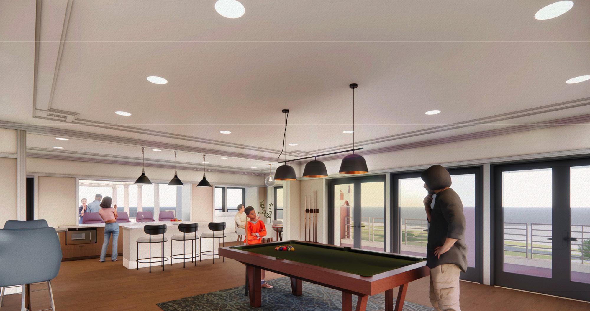 Lobby along Broad Street, the amenity spaces, amenity restrooms, Fitness Room, Residential units, and Residential Corridors.