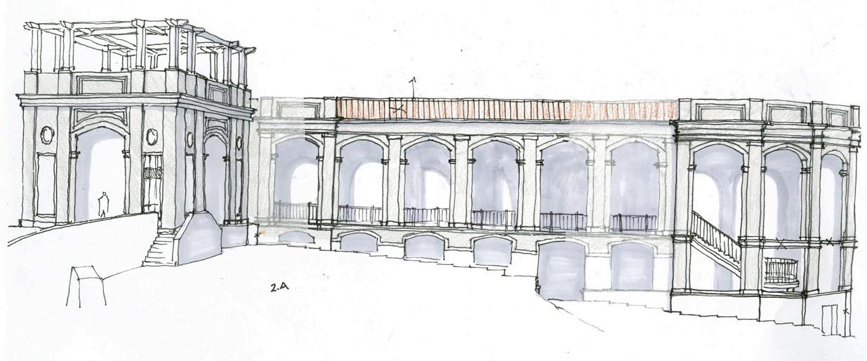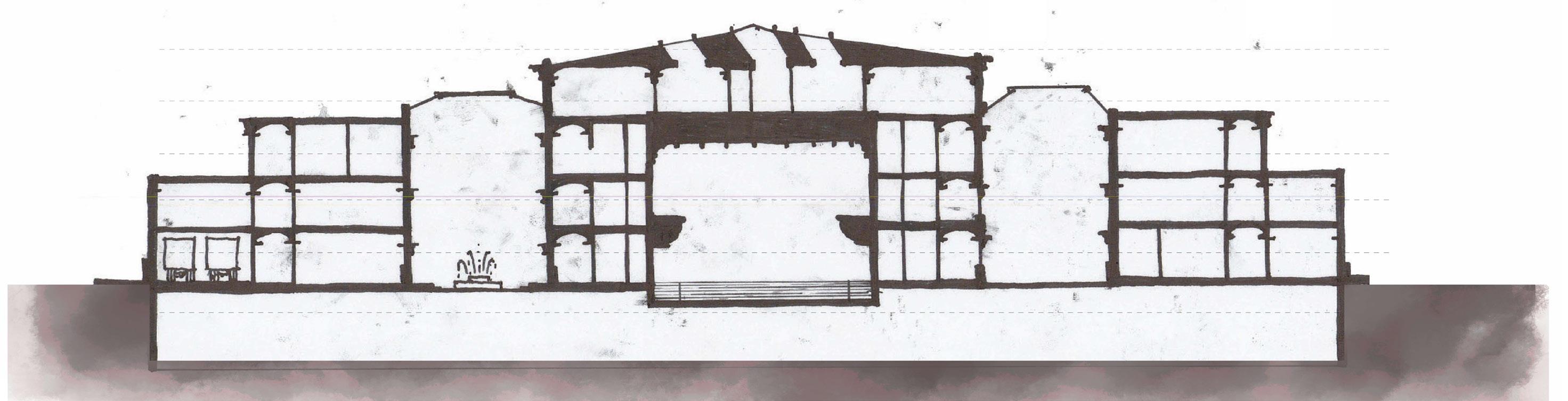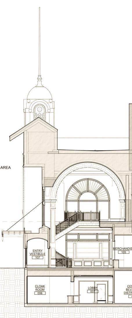 Salvaged materials from the historic National Theatre are repurposed as architectural and storytelling elements throughout the project.