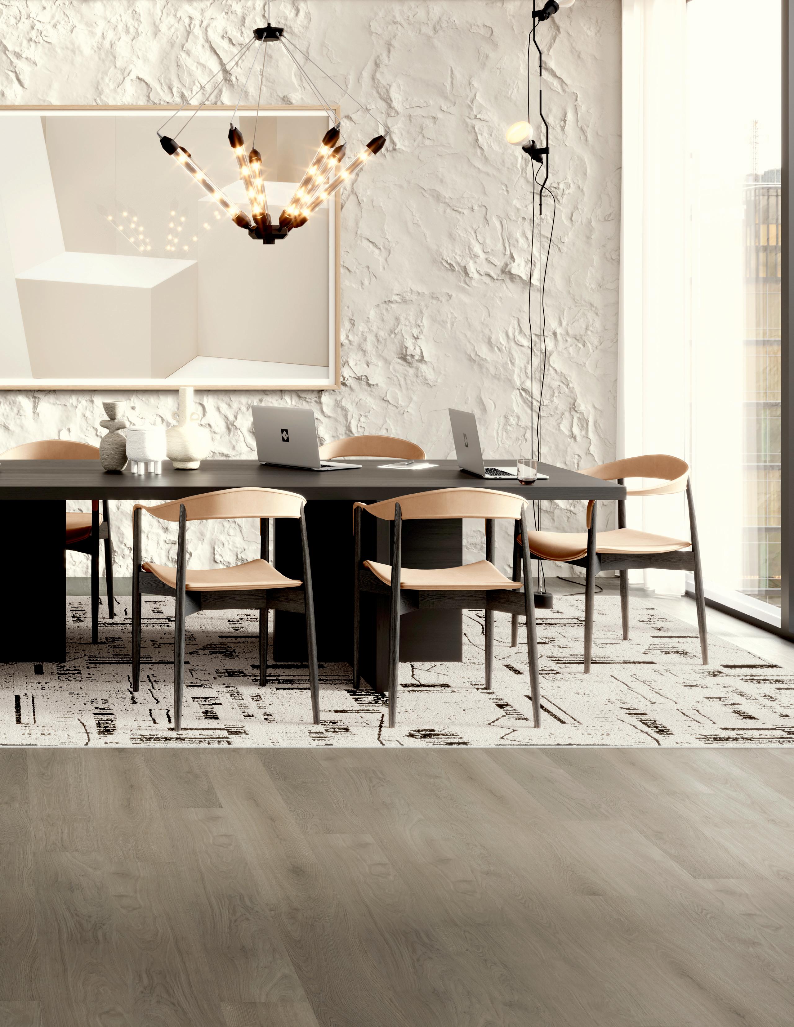 The 5 mm thick LVT and 4 mm thick profiles work alongside most carpet tile for smooth transitions throughout your space with no need for a transition strip. Direct glue installations only.