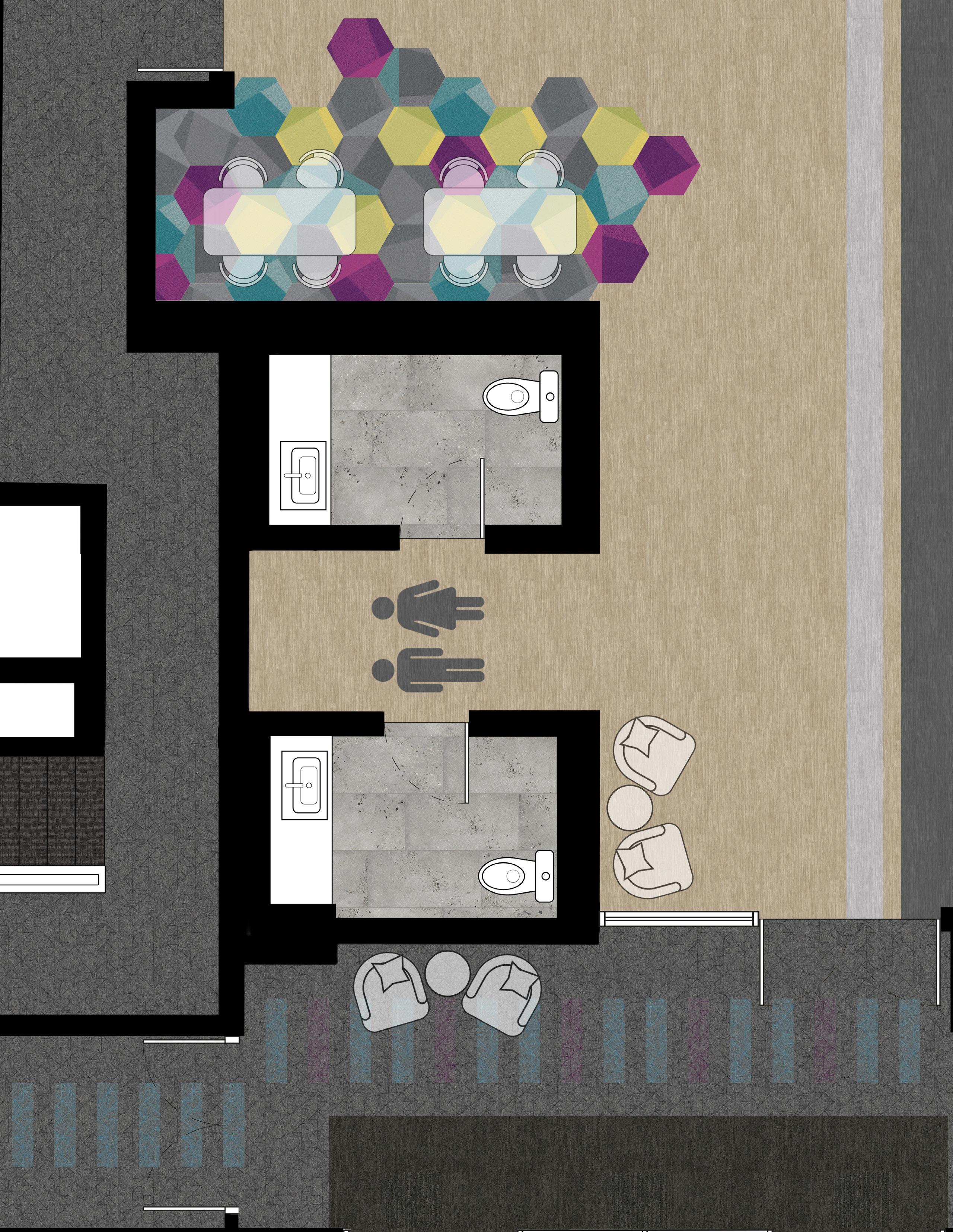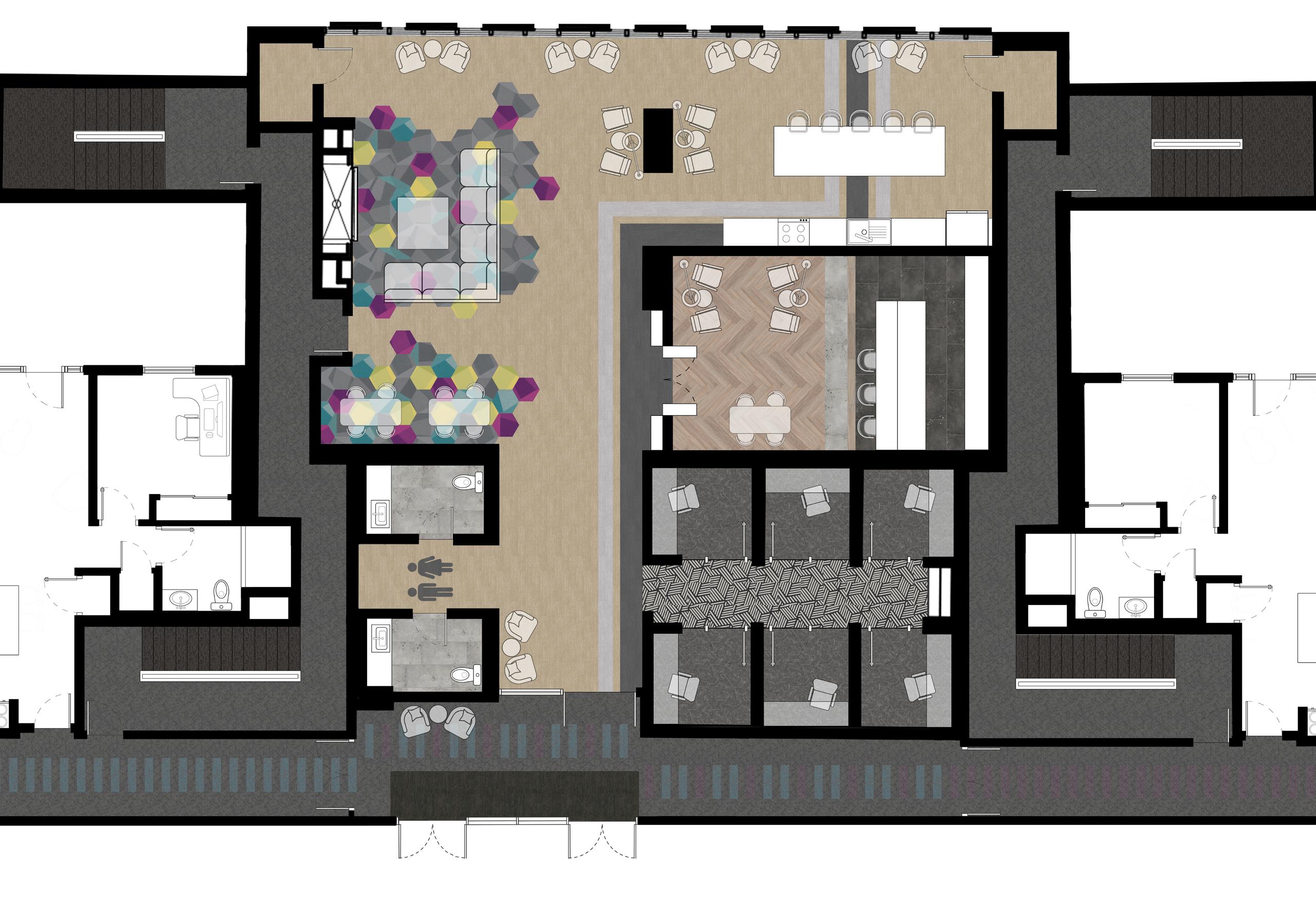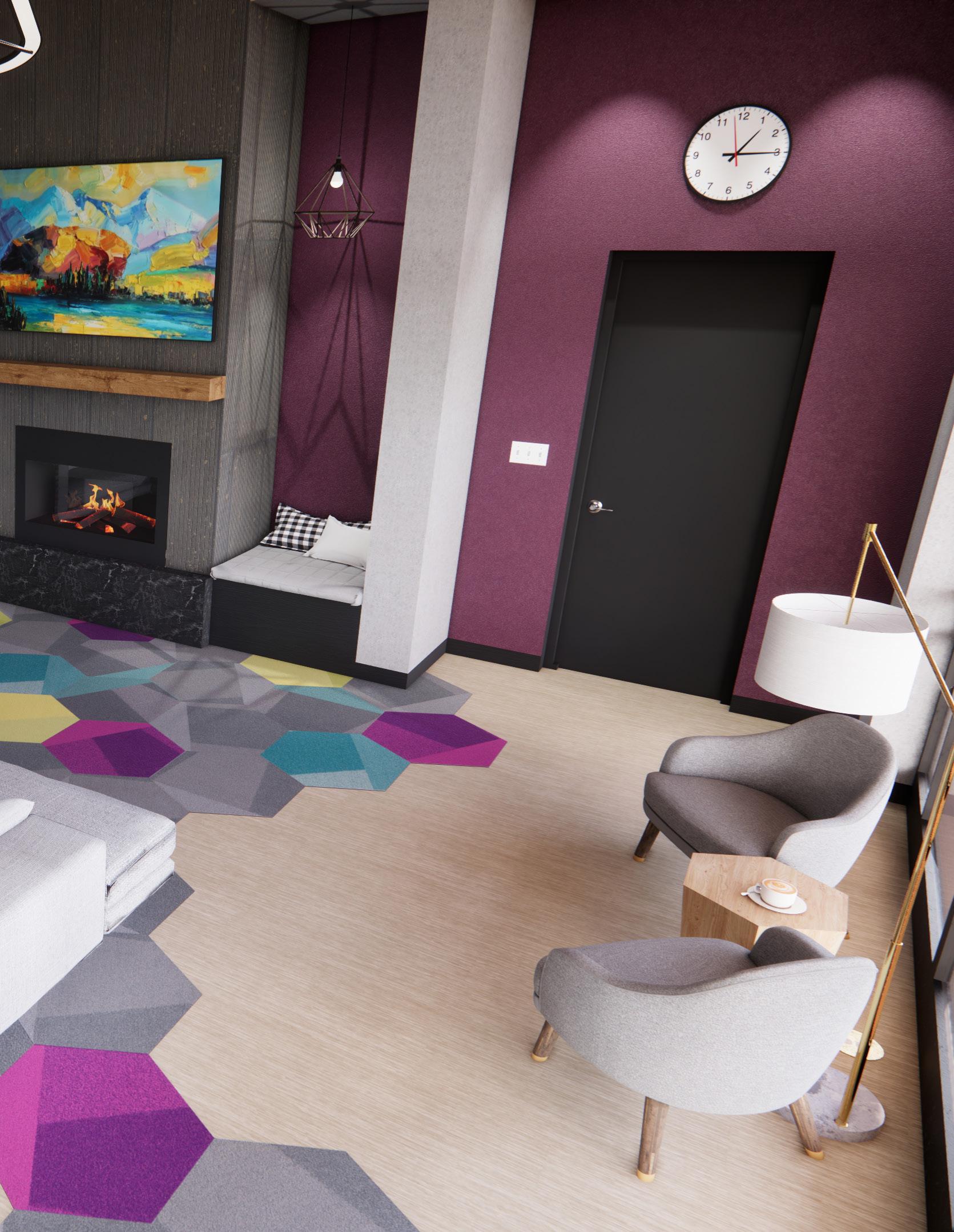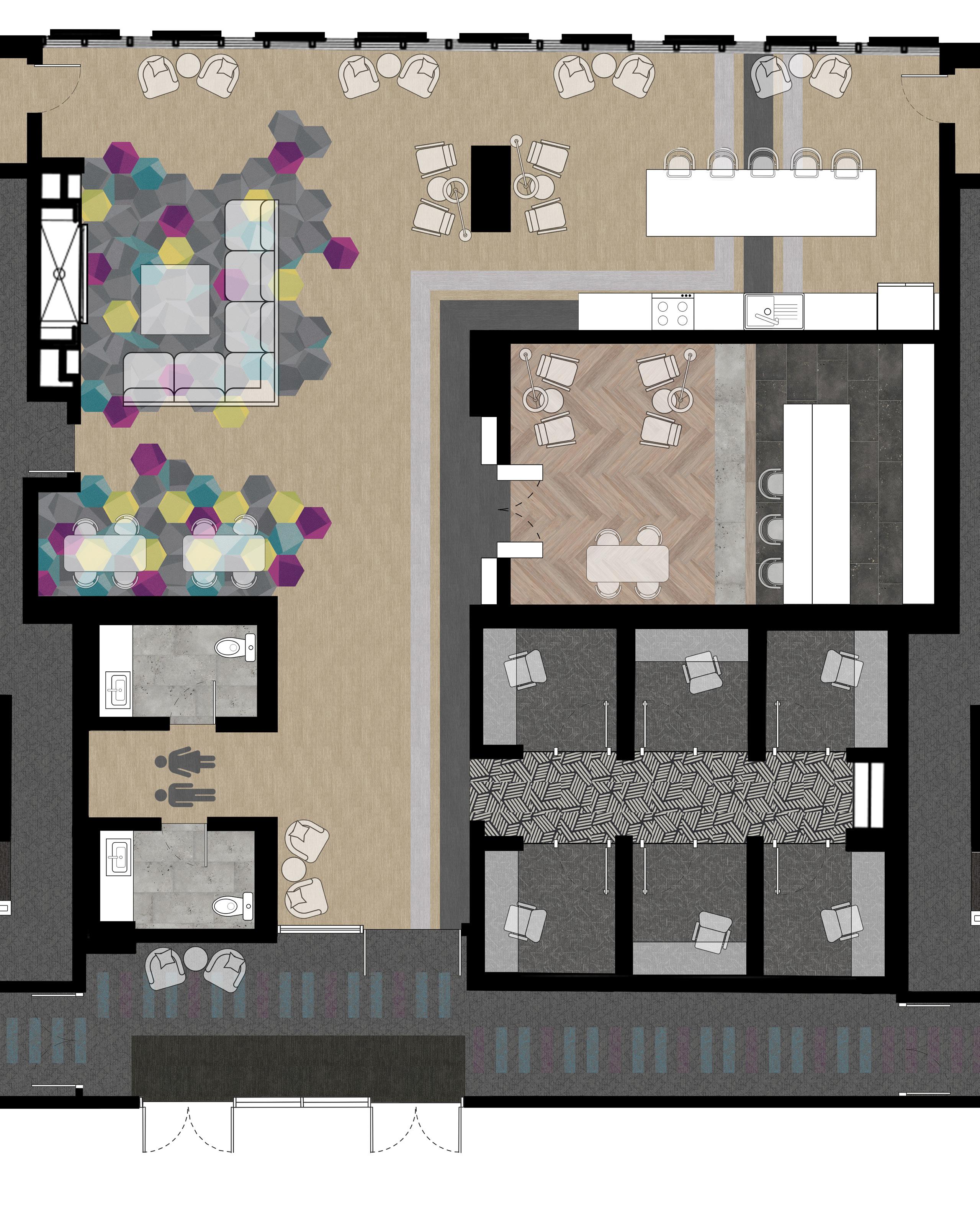 In corridor zones, three tones of carpet tile shift from blue to purple, guiding movement and marking the intersection of two dormitory wings. This subtle gradient supports wayfinding while visually reinforcing the idea of connected student communities.