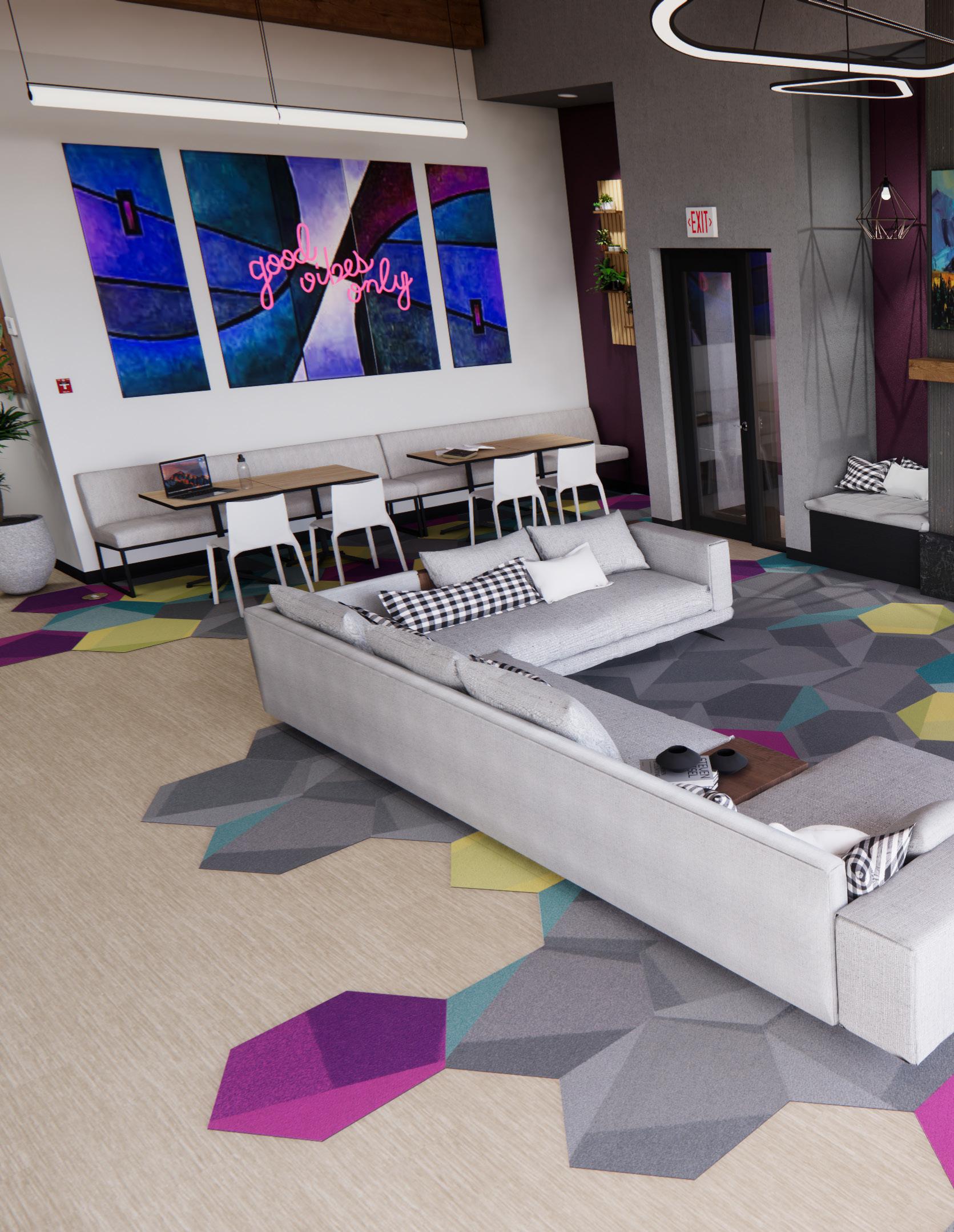 Playful and bold, this geometric carpet tile moves beyond traditional school palettes infusing the space with a vibrant, Miami-inspired energy. Its organic layout mimics the feel of custom rugs, while also offering acoustic benefits and visual interest for highly active, shared environments.