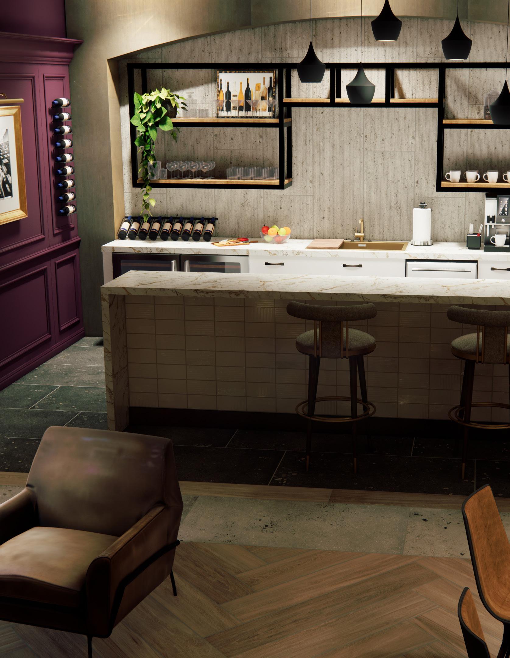 With deep gray tones and a sleek finish, Stellar sets the mood in the speakeasy. Durable and sophisticated, it anchors the bar area and establishes a dramatic focal point.