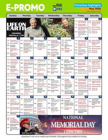 SCHEDULE All programming subject to change a.m. morning p.m. afternoon/evening (Date) = shown on this date only 6:00 Wild Kratts 6:30 Weather Hunters 7:00 Lyla in the Loop 7:30 Carl the Collector 8:00 Daniel Tiger’s Neighborhood 8:30 Phoebe & Jay 9:00 Sesame Street 9:30 Work It Out Wombats! 10:00 Donkey Hodie 10:30 Rosie’s Rules 11:00 Elinor Wonders Why 11:30 Alma’s Way 12:00 Molly of Denali 12:30 Xavier Riddle 3:00 Health Programming 5:00 BBC News The Context USA 5:30 BBC World News America 6:00 PBS News Hour May 2026 is Asian American Pacific Islander Heritage Month. Look for this symbol (AAPIHM) throughout the highlights guide to find programming that highlights the contributions of this group. We will also be celebrating our nations heros and veterans with Stories of Service with this symbol (SOS). *RMPBS denotes Rocky Mountian PBS