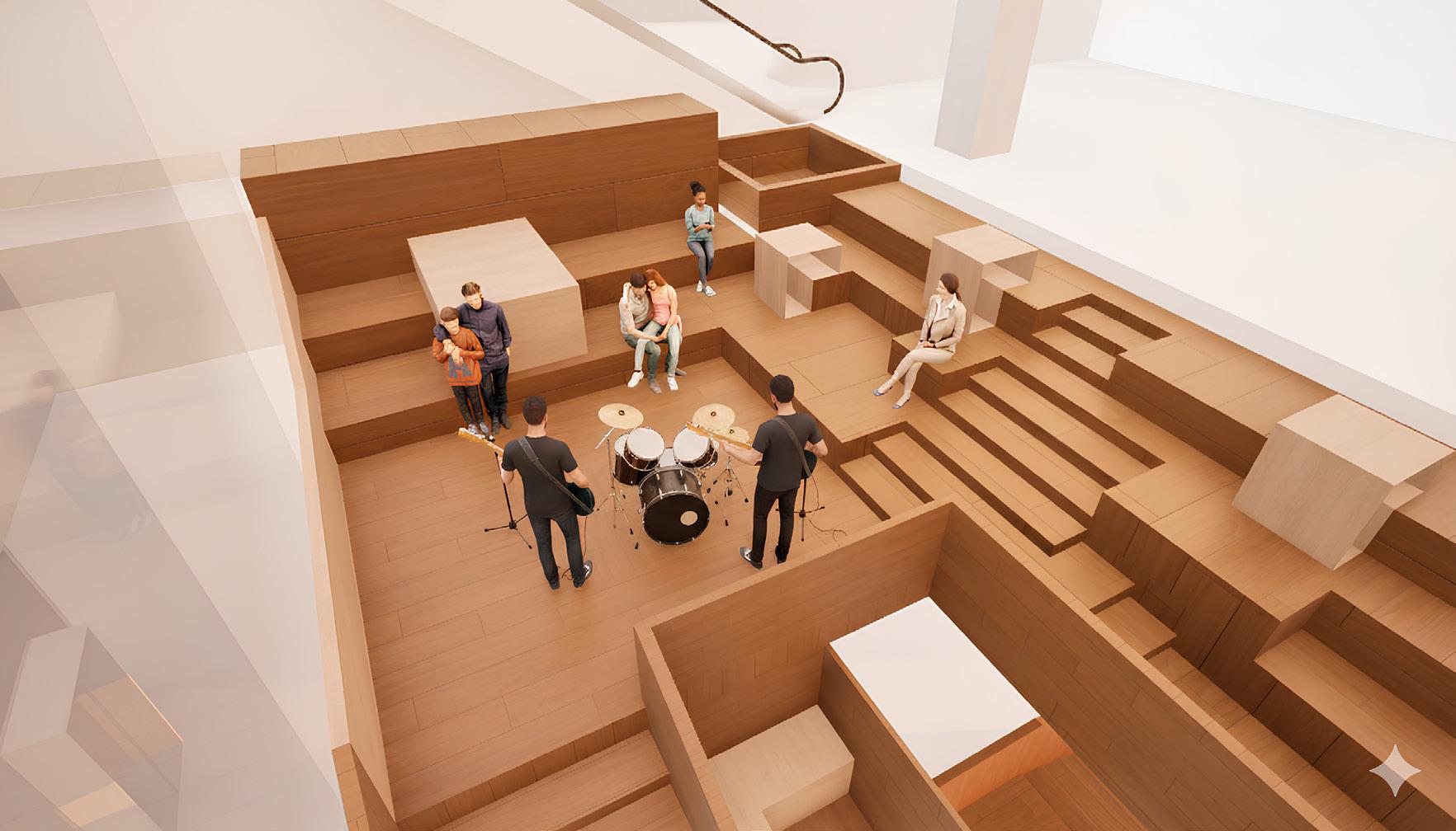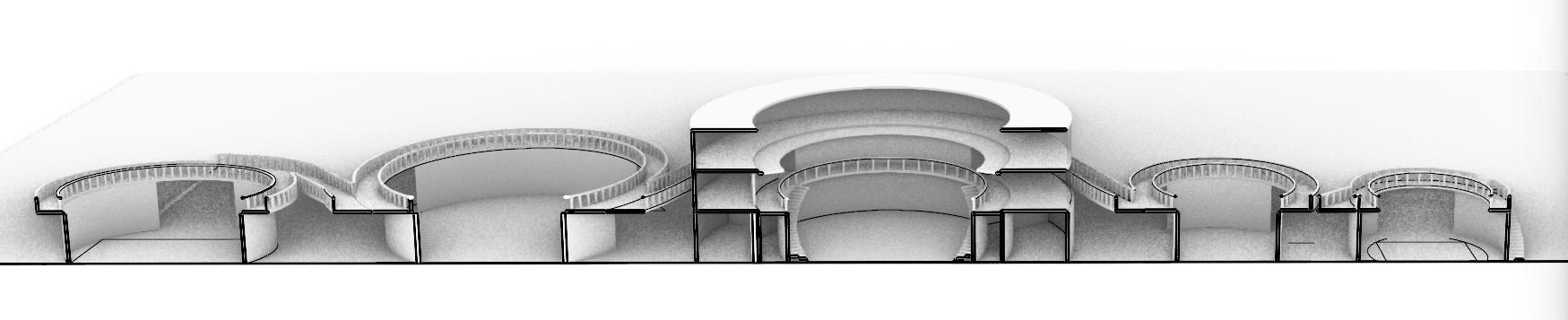 This sectional perspective illustrates how the upper, middle, and lower levels are vertically connected through the shared atrium. The platforms surrounding the central void create a theatre effect — people on the upper levels can look down toward the performance stage below, while those in the basement can look upward, fostering visual interaction and spatial engagement. This vertical relationship activates the transportation hub, transforming it into a vibrant, multifunctional center.