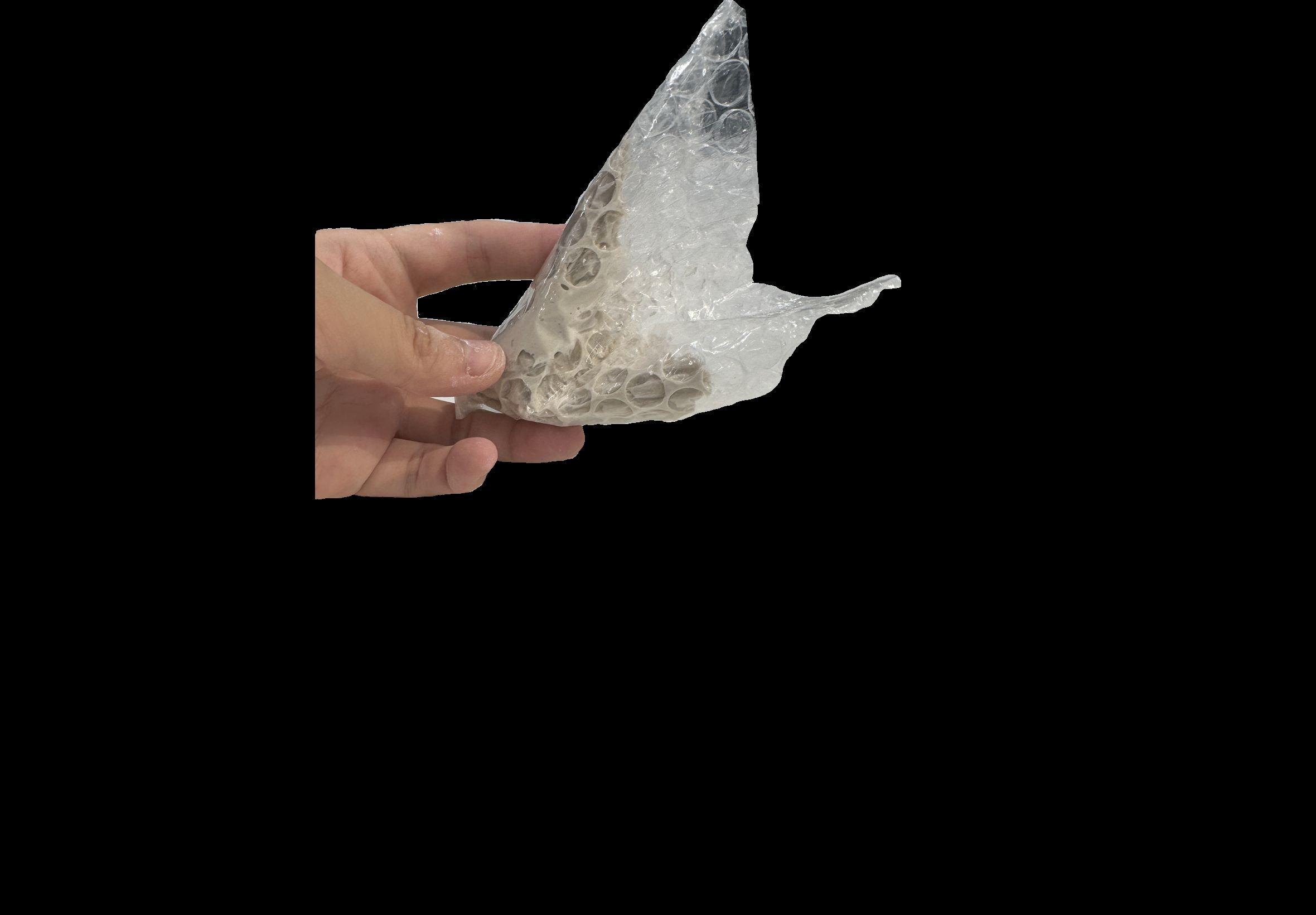 Various types of plastic bags were used as casting containers, including standard plastic bags and bubble wrap. Due to their formless nature, the bags allow the plaster to behave freely, resulting in more unpredictable outcomes.