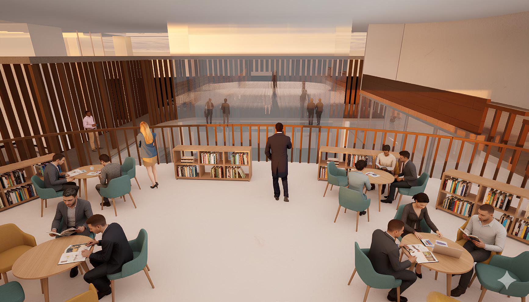 Visitors can look down from the platform to observe the activity below, or spend time in the reading corner, enriching their minds through quiet moments with a book.