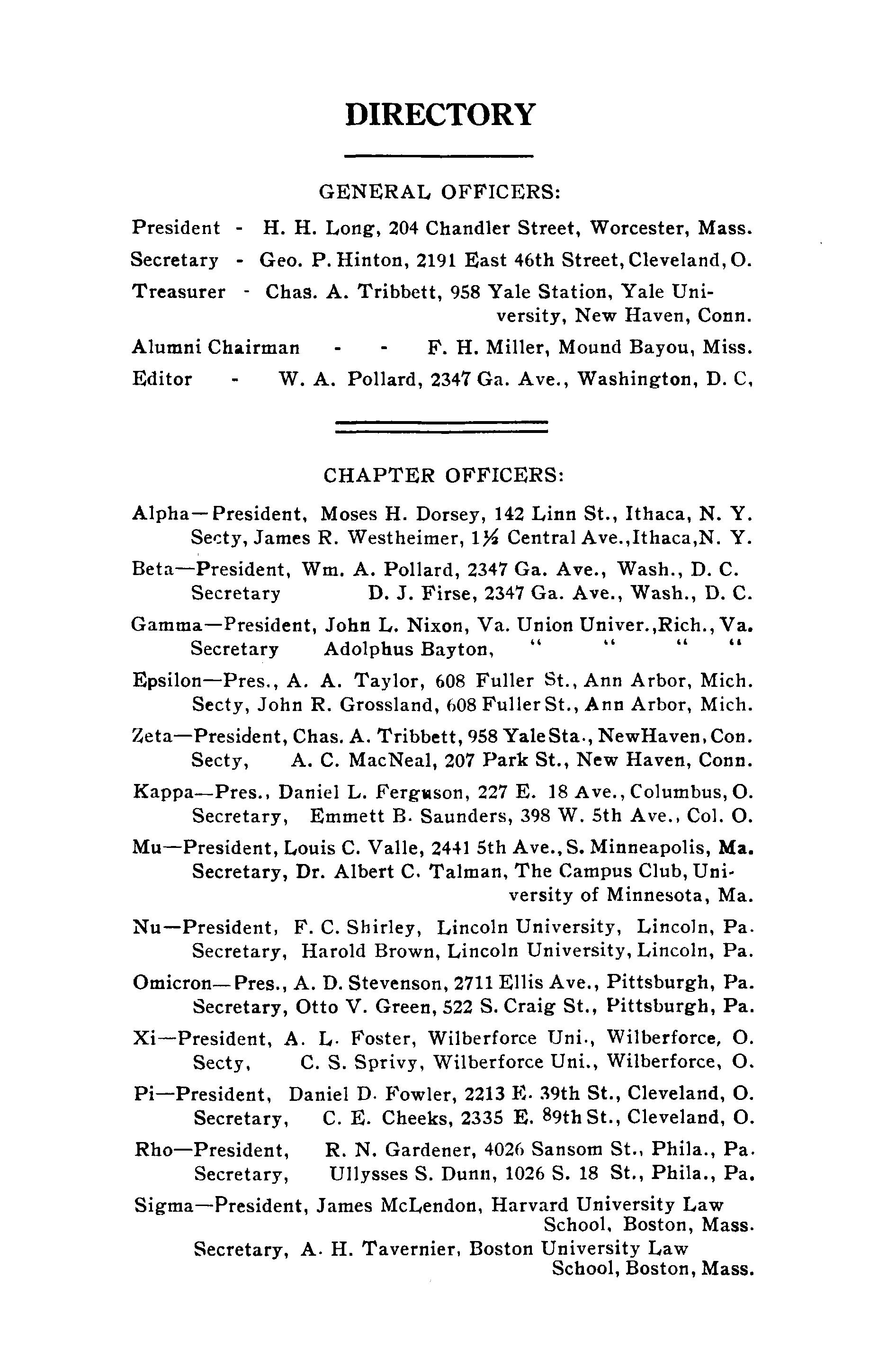 Pi—President, DanielD.Fowler,2213E-39thSt.,Cleveland, O. Secretary, C E Cheeks,2335E 89thSt.,Cleveland, O Rho—President, R.N.Gardener,4026SansomSt.,Phila., Pa. Secretary, UllyssesS.Dunn,1026S.18 St.,Phila., Pa.