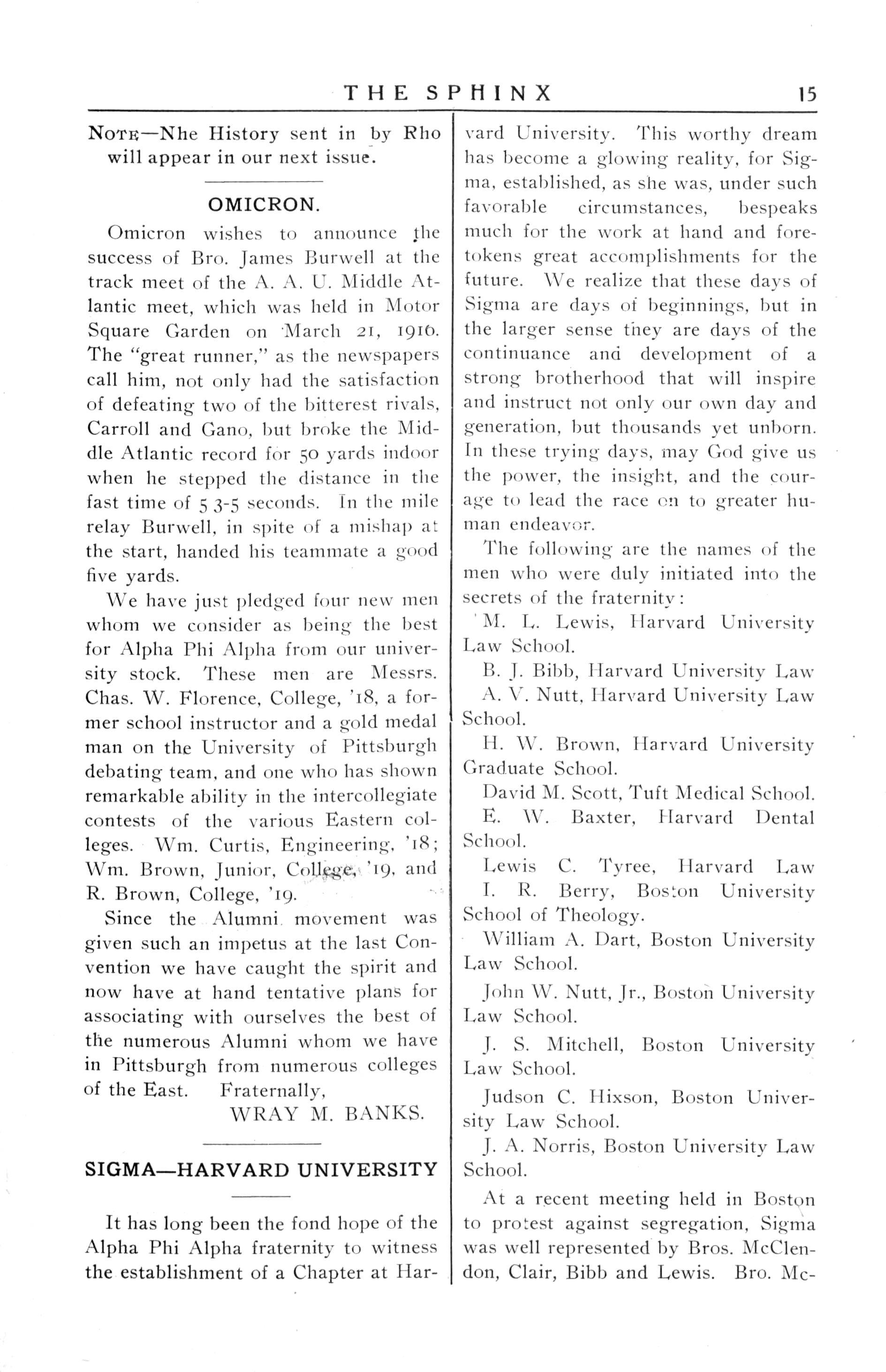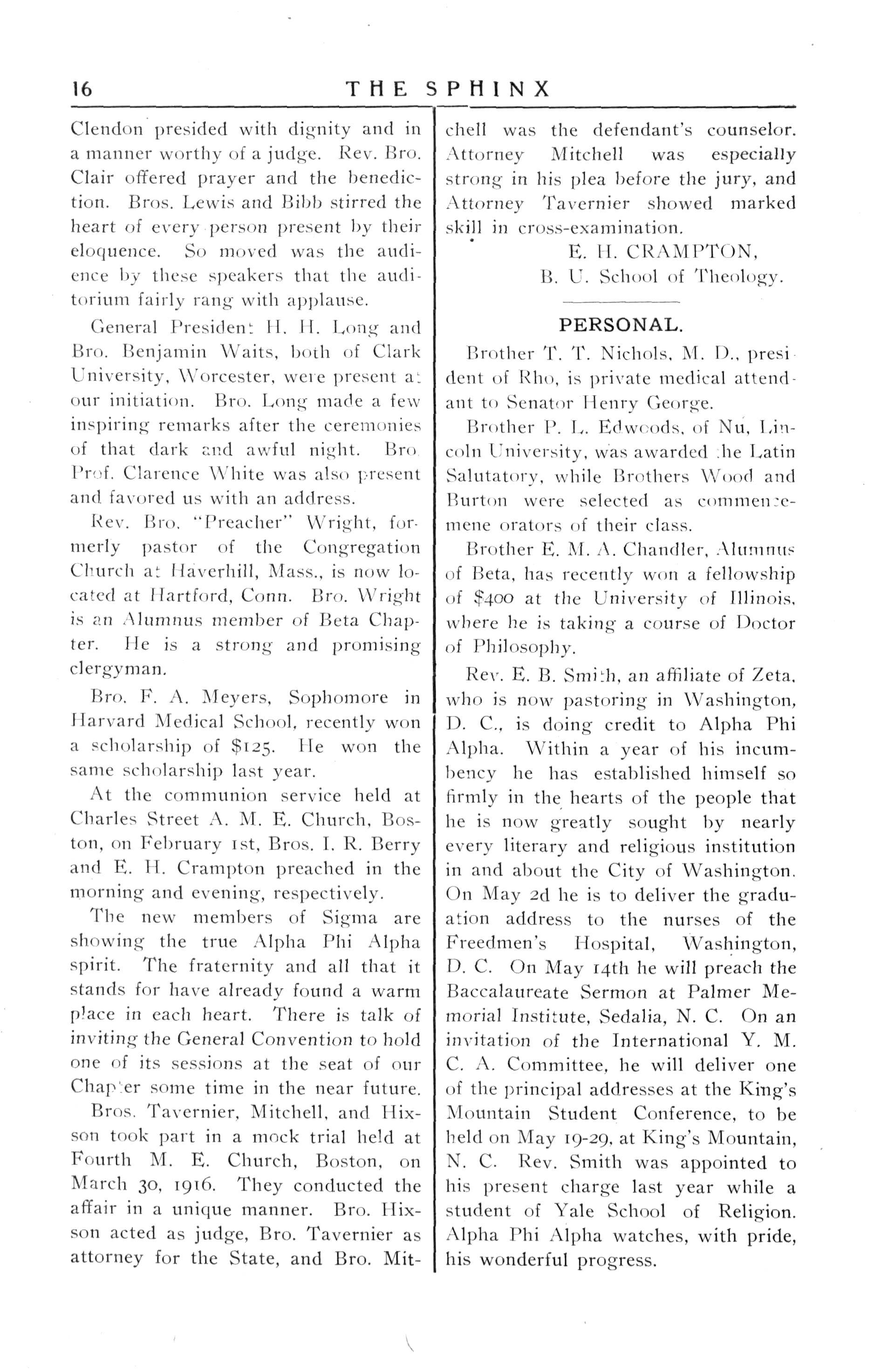 The new members of Sigma are showing the true Alpha Phi Alpha spirit. The fraternity and all that it stands for havealready found a warm place in each heart There is talkof invitingtheGeneralConventiontohold one of its sessions at the seat of our Chapter some time inthe near future Bros Tavernier, Mitchell, and Ilixson took part in a mock trial held at Fourth M. E. Church, Boston, on March 30, 1916 They conducted the affair in aunique manner Bro llixson acted asjudge, Bro.Tavernier as attorney for the State, and Bro Mit-