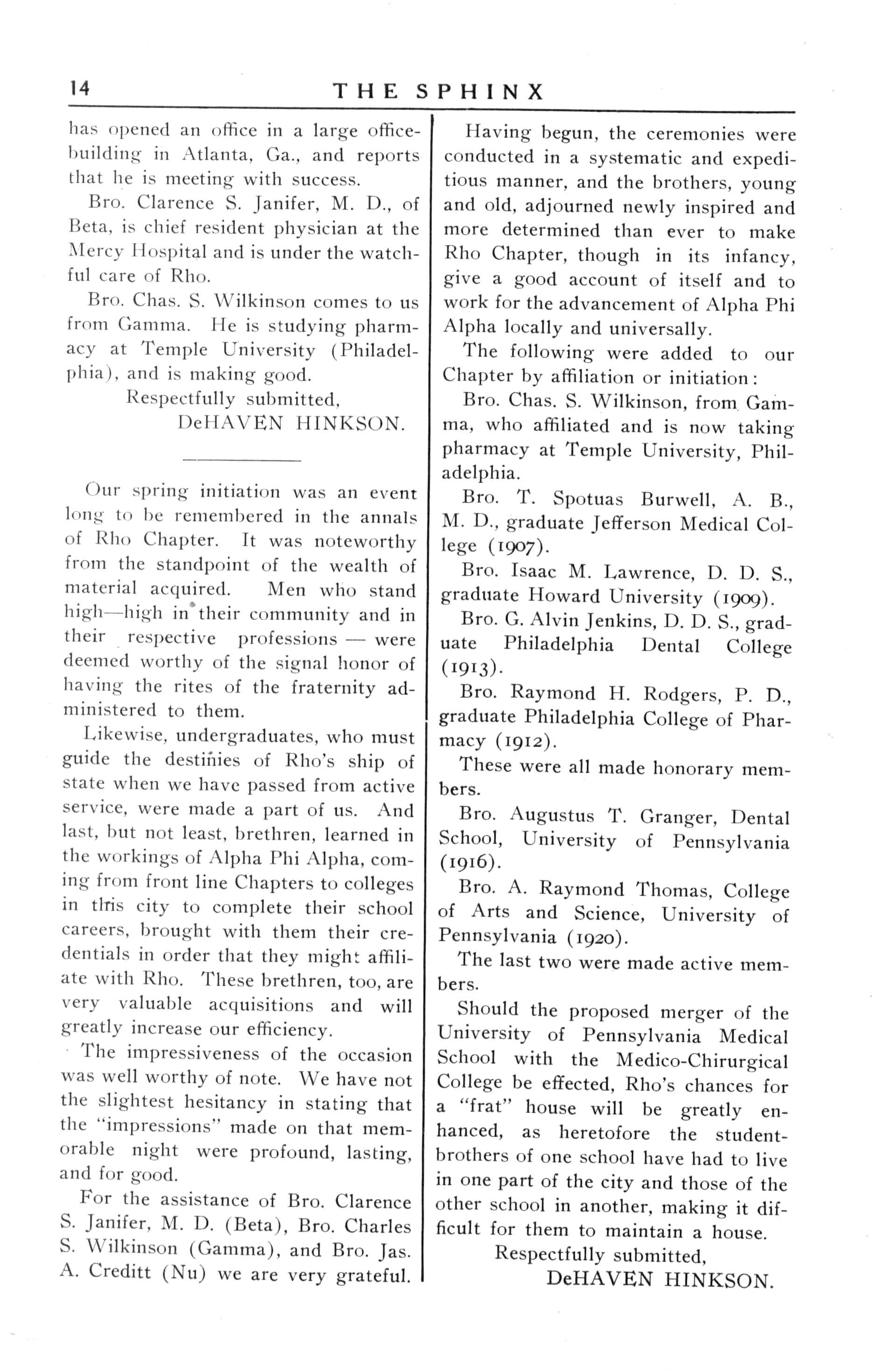 For the assistance of Bro Clarence S.Janifer, M.D. (Beta), Bro. Charles S Wilkinson (Gamma),and Bro Jas A Creditt (Nu) weare very grateful