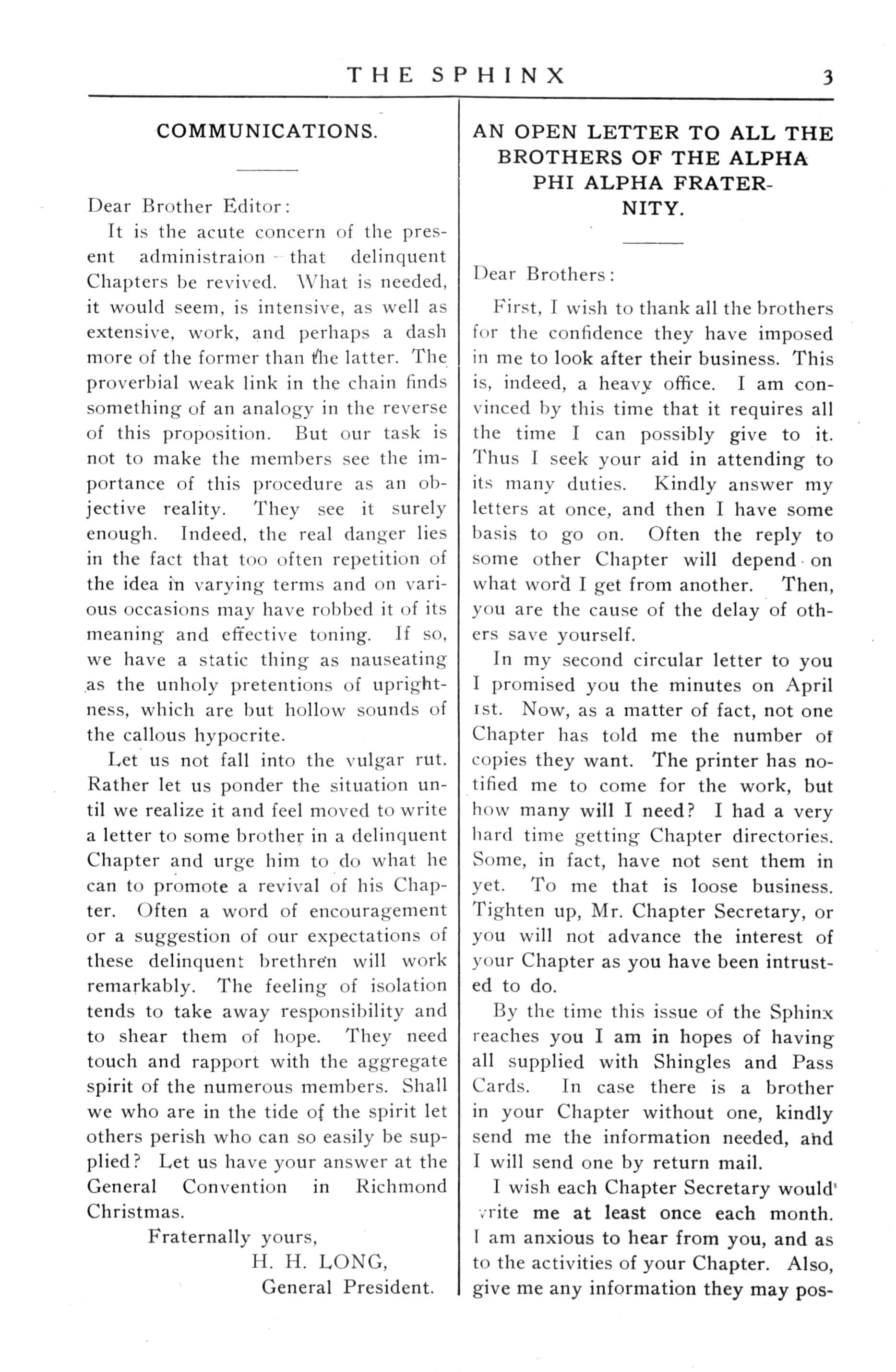 I trust that each brother inthe fraternity will write direct to any member of the following'mentioned Chapters, inschool or out, and also advise theSecretaryofthebrother'snameand address, sothat hemay get some line of action established At this writing we find from the minutes of the last General Convention the following Chapters as inactive or not represented: Alpha Alumni, Alpha Lambda. Delta, Iota, Mu, Theta. and Lambda. Since the convention we have been able to establish communication with Mu However,theremainderhavenot seen lit to answer our letters or else they have not received them In the caseof Helta,and Eota,wehavenoaddress of any member of their Chapter oranyone now inschoo.l