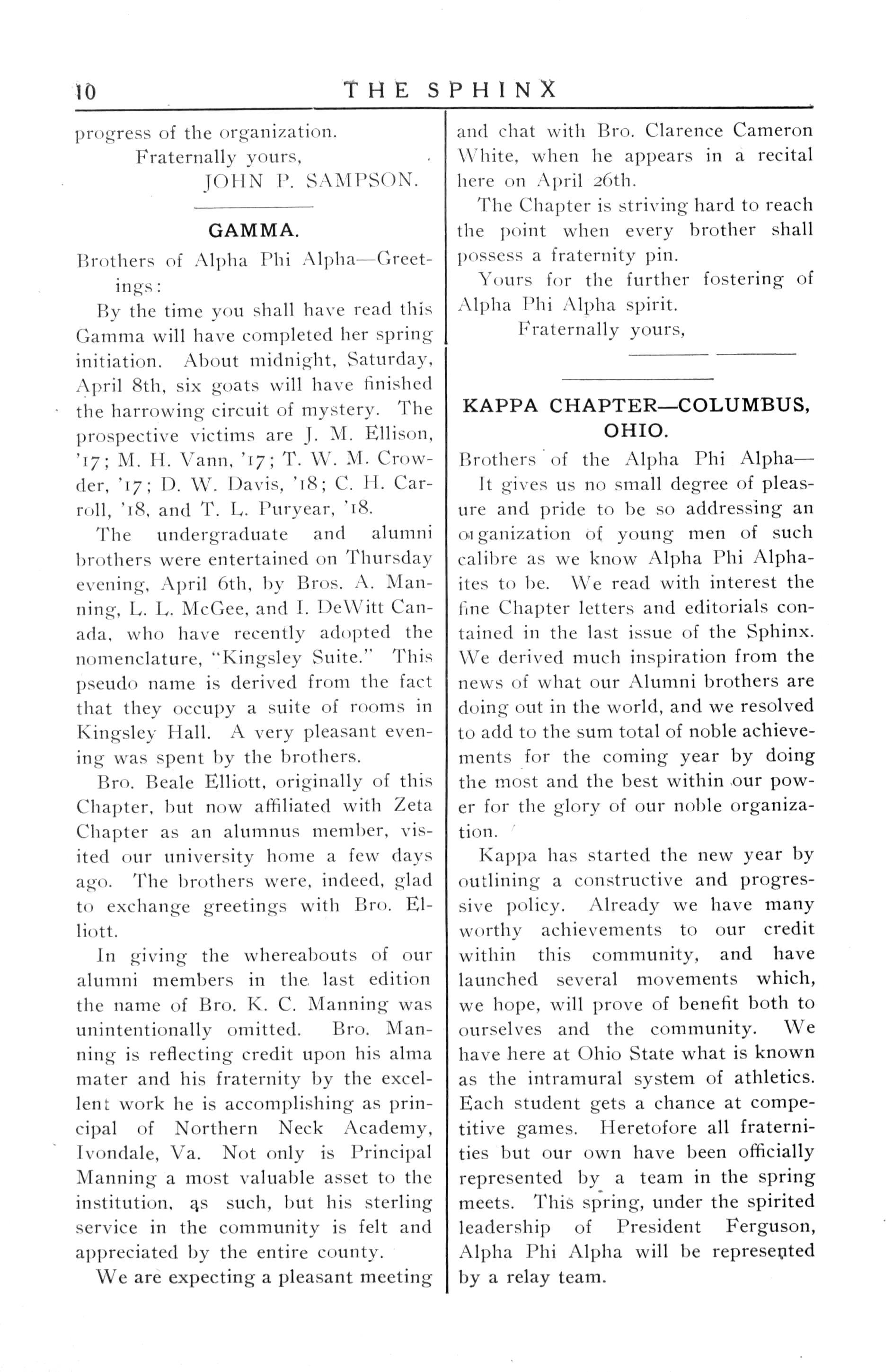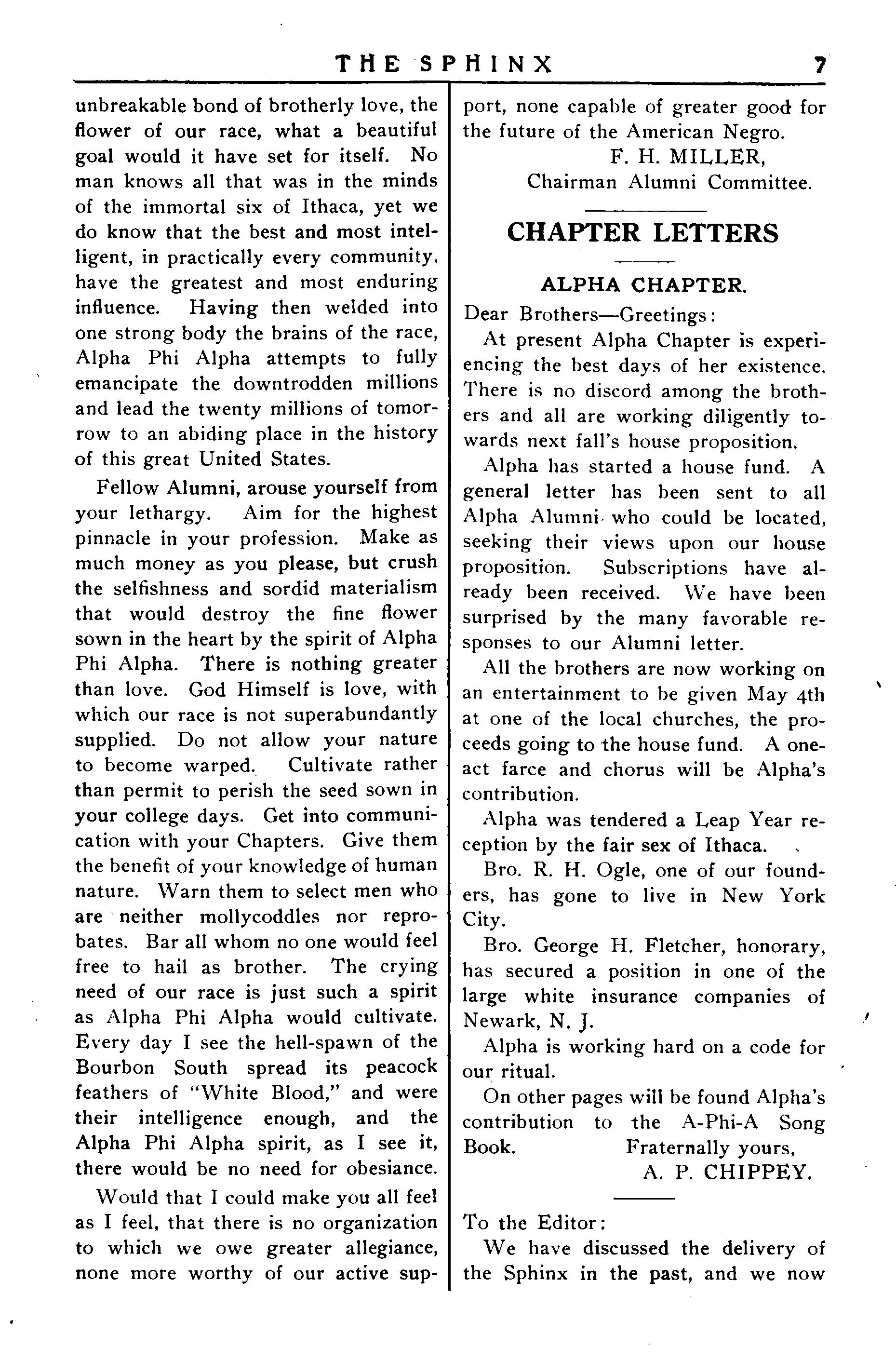 .Muchcredit belongs to our worthy editor of the Sphinx for so soon executing the improvements suggested at the General Convention May he advancetothehighestrungof perfection the work thus far so nobly advanced byBros CannonandMcGhee,andmay the Sphinx be as a fountain of light whereby each Chapter can obtain the spark of fraternalism.