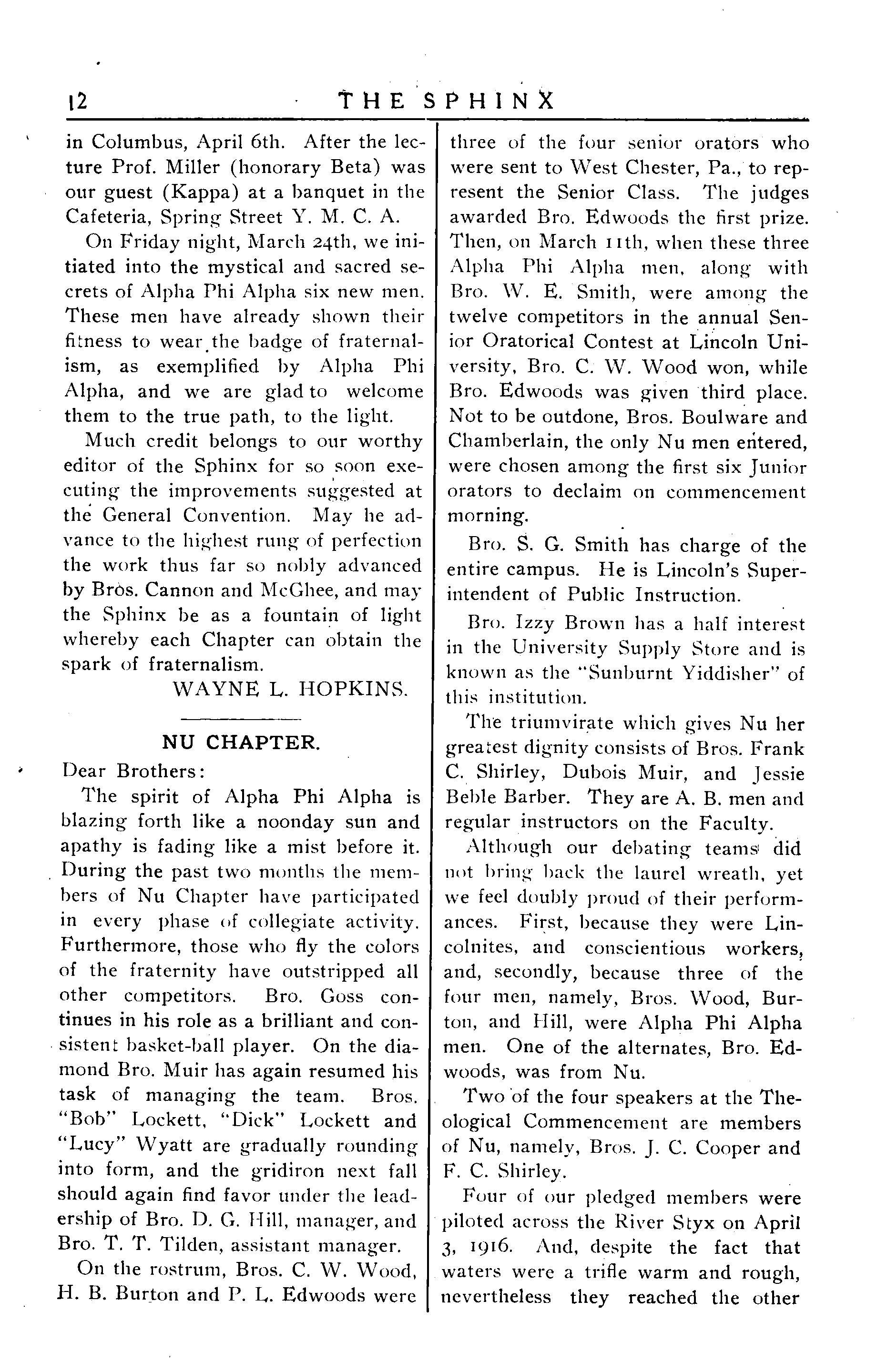 Although our debating teams' did not bring back the laurel wreath, yet wefeeldoubly proudoftheir performances. First, because they were Lincolnites, and conscientious workers, and, secondly, because three of the four men, namely, Bros Wood, Burton, and Hill, were Alpha Phi Alpha men Oneof thealternates, Bro Edwoods was from Nu