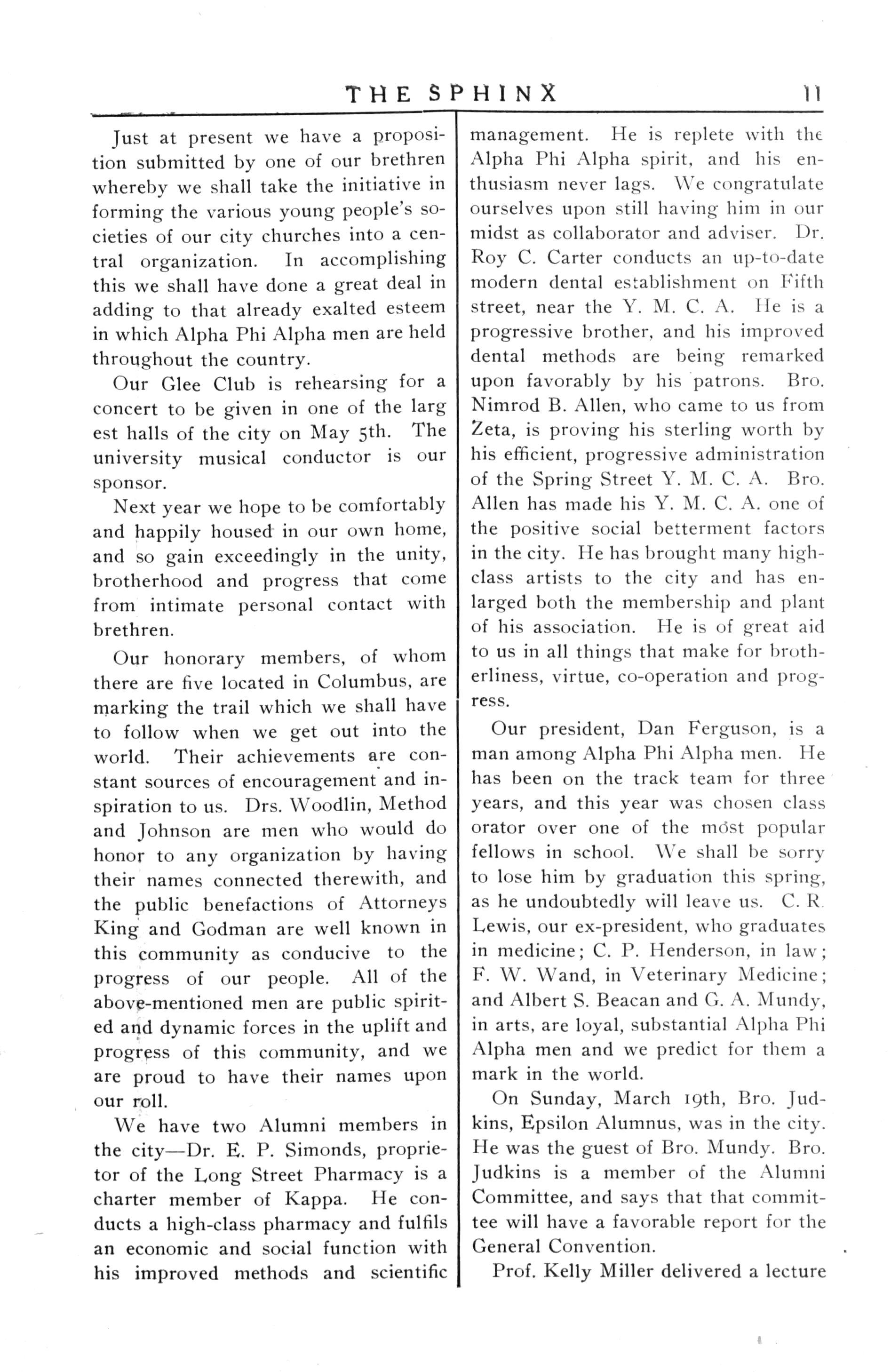 management. He is replete with the Alpha Phi Alpha spirit, and his enthusiasm neverlags. We congratulate ourselves upon stillhavinghim inour midstascollaboratorandadviser Dr Roy C Carter conducts an up-to-date modern dental establishment on Fifth street, near the Y.M.C.A. He isa progressive brother, and his improved dental methods are being remarked upon favorably by his patrons Bro NimrodB Allen,whocametous from Zeta, isproving his sterlingworth by hisefficient, progressive administration oftheSpringStreetY.M.C.A. Bro. AllenhasmadehisY.M.C.A.oneof the positive social betterment factors inthecity Hehasbroughtmanyhighclass artists to the city and has enlargedboth themembership and plant of hisassociation. He isof great aid tousinallthingsthatmakefor brotherliness,virtue,co-operation and progress