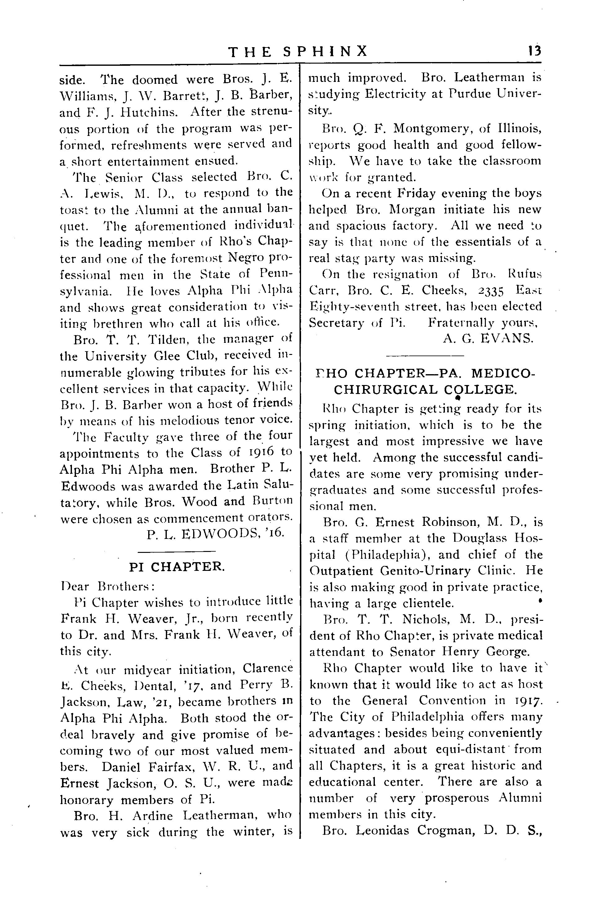 The Senior Class selected Bro C A Lewis M !)., to respond to the toast totheAlumniattheannual banquet. The aforementioned individual istheleadingmember of Rho's Chanterandoneoftheforemost Negroprofessional men in the State of Pennsylvania lie loves Alpha Phi Alpha and shows great consideration to visiting brethren whocall at his office.